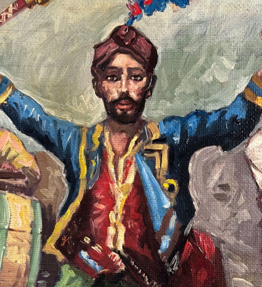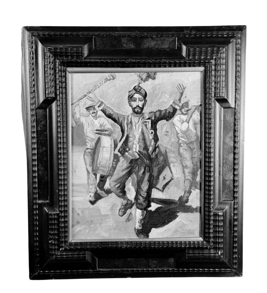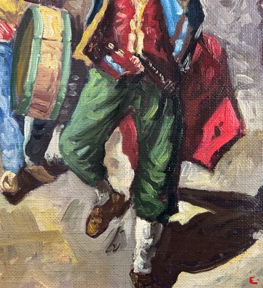 Dipinto olio su tela applicata su pannello, periodo XX secolo scuola italiana, raffigurante Artista di strada. Dimensioni compreso cornice: 62x72 cm. Dimensioni interno cornice: 40x50 cm. Reca firma in basso a destra da artista non identificato. Opera in buone condizioni.