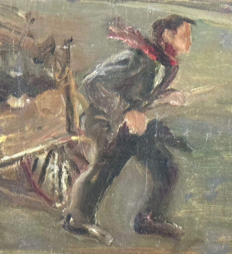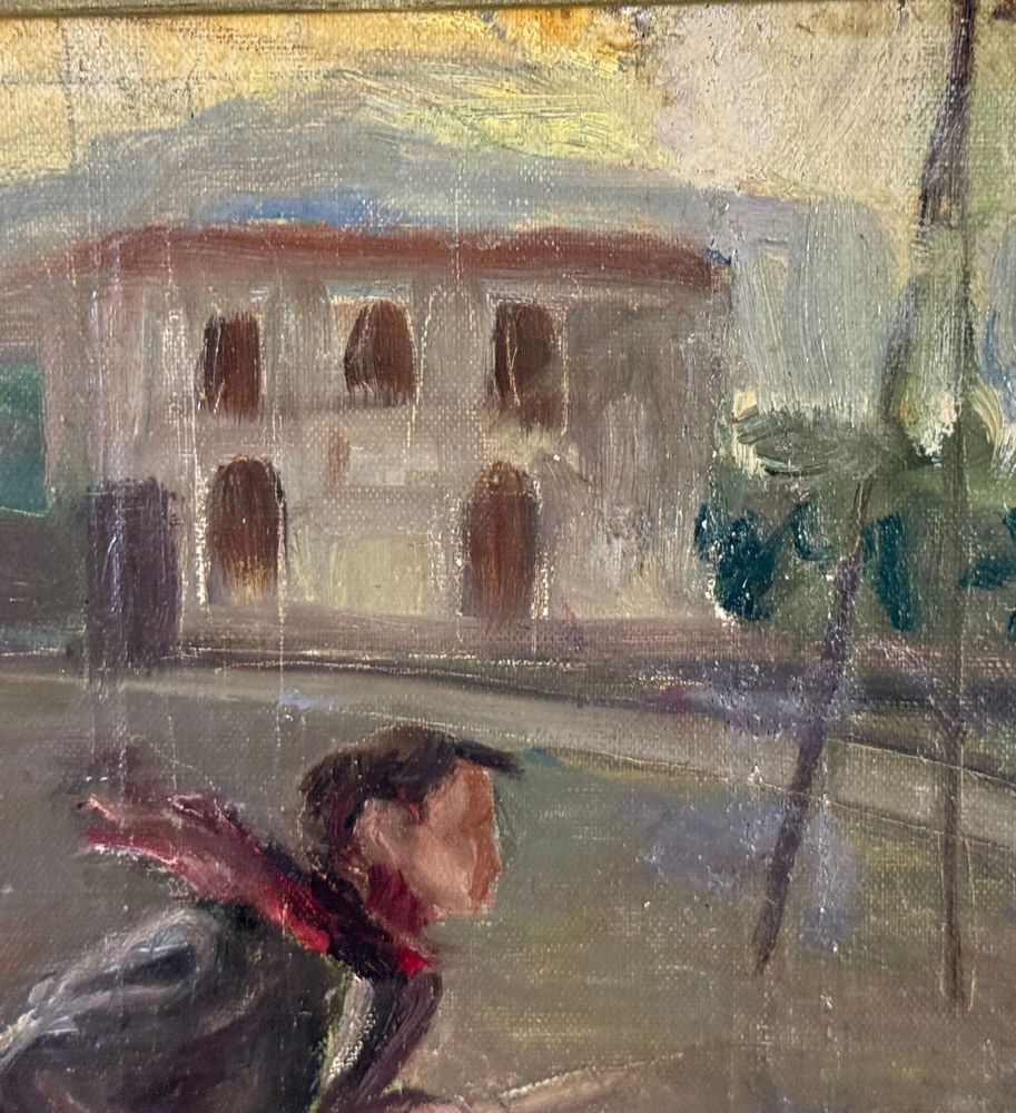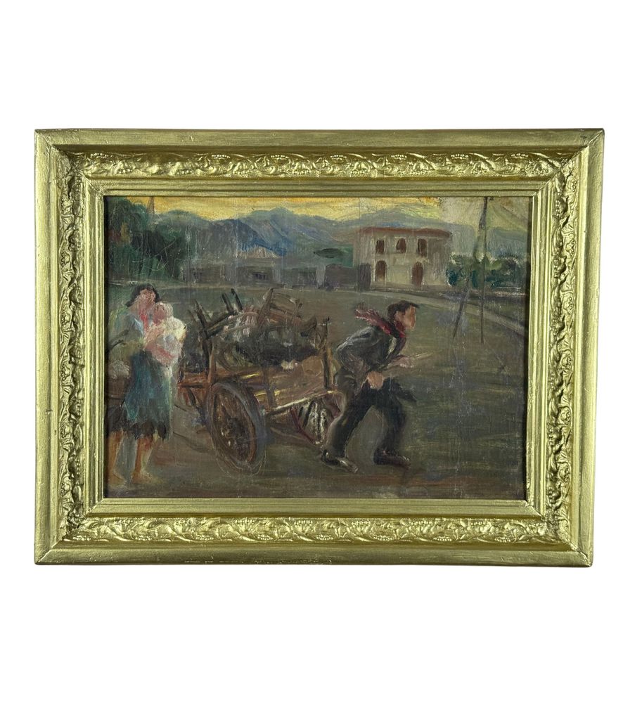 Dipinto olio su tela applicata su pannello, periodo XX secolo scuola Italiana, raffigurante "Il Trasloco". Dimensioni compreso cornice: 57x44 cm. Dimensioni interno cornice: 44x32 cm. Da artista anonimo. Opera in buone condizioni.