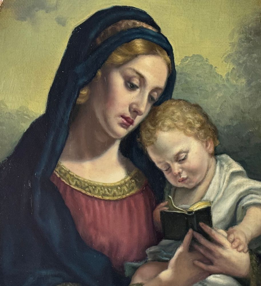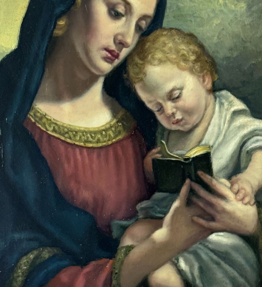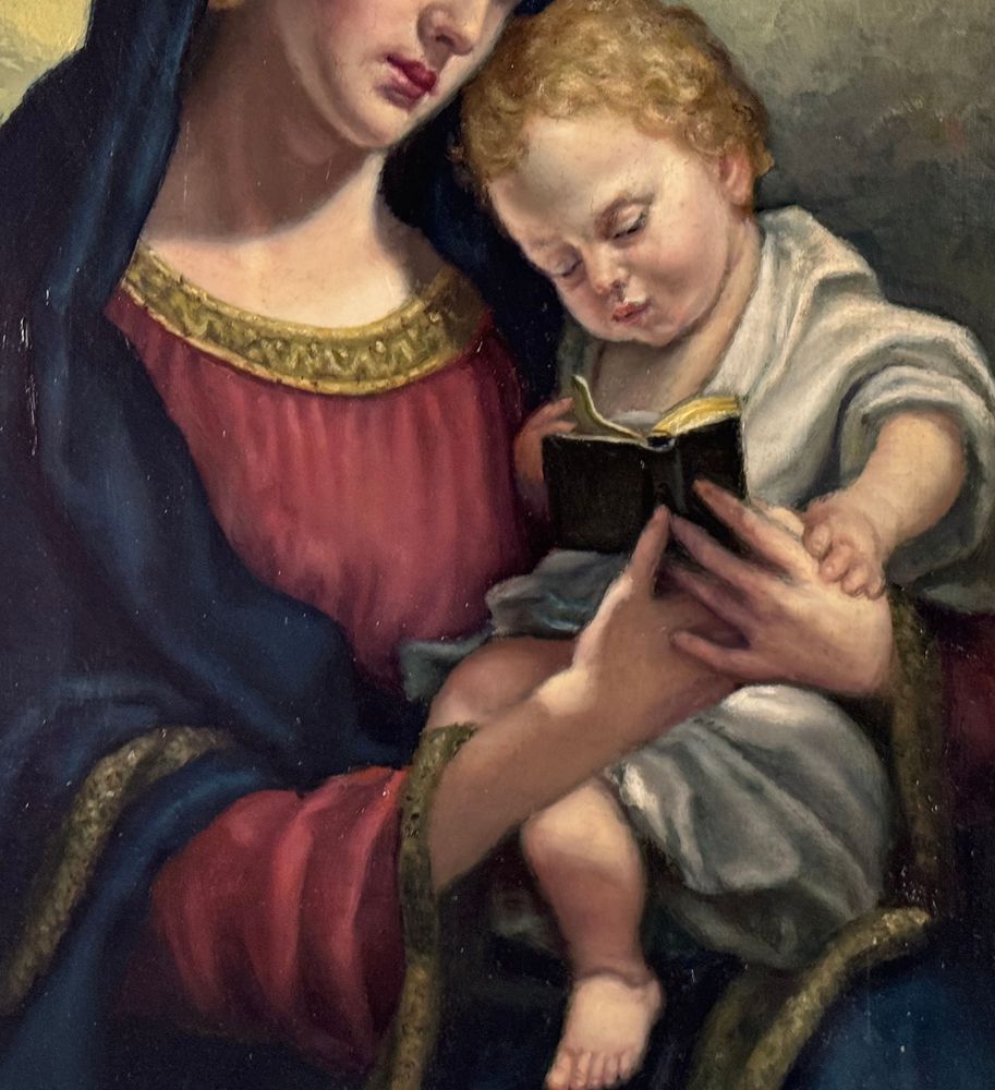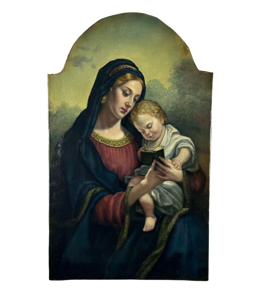 Dipinto olio su tela, periodo XIX/XX secolo scuola Italiana, raffigurante Madonna con bambino. Opera accademica. Trasporto da boiserie al telaio Dimensioni: 43x70 cm. Da artista anonimo. Opera in buone condizioni.