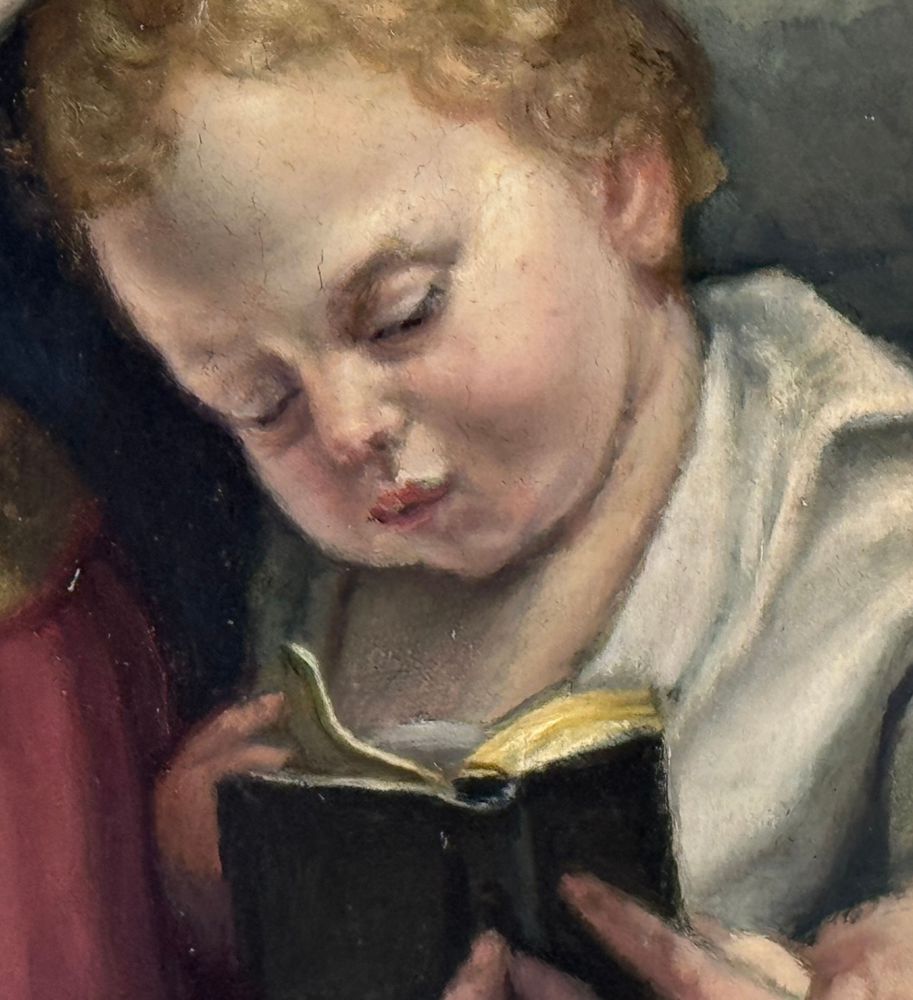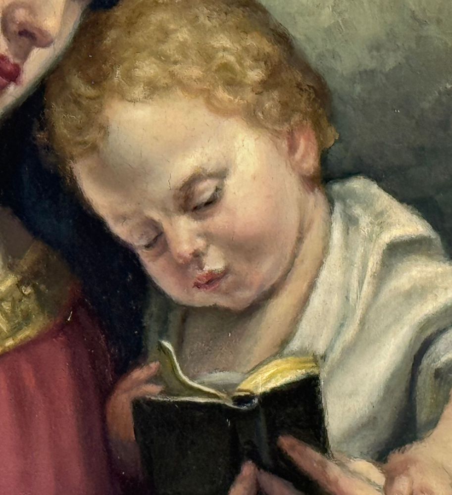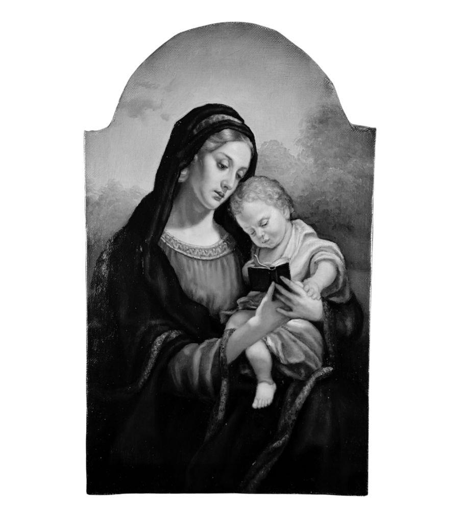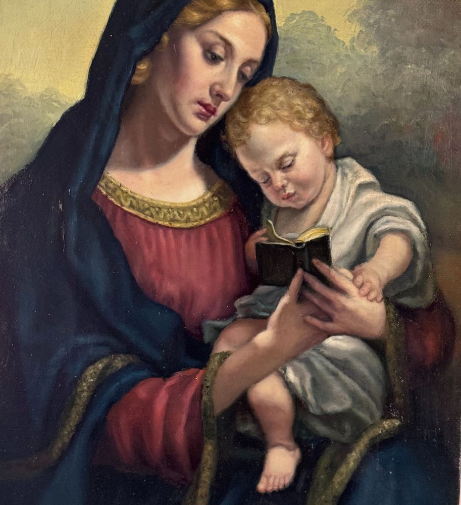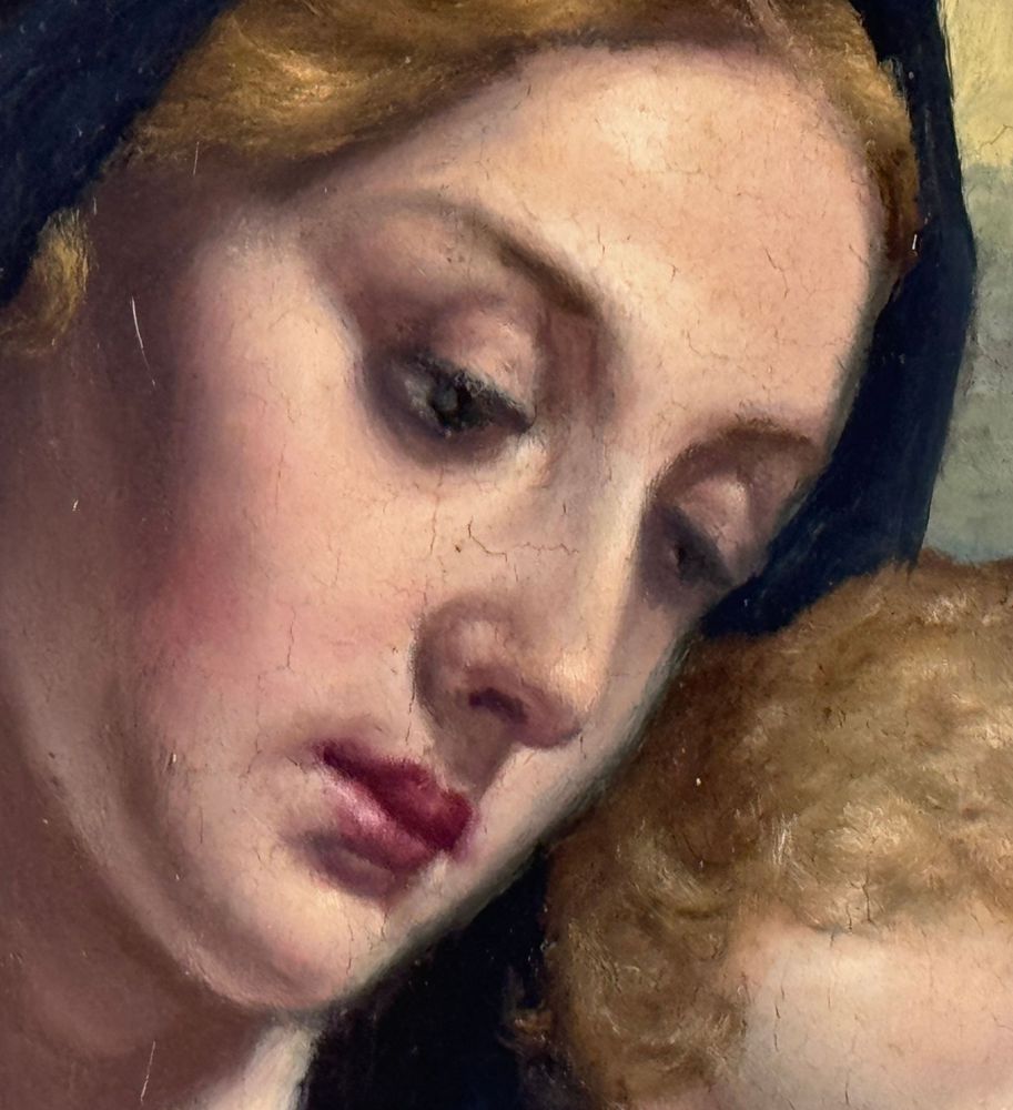 Dipinto olio su tela, periodo XIX/XX secolo scuola Italiana, raffigurante Madonna con bambino. Opera accademica. Trasporto da boiserie al telaio Dimensioni: 43x70 cm. Da artista anonimo. Opera in buone condizioni.