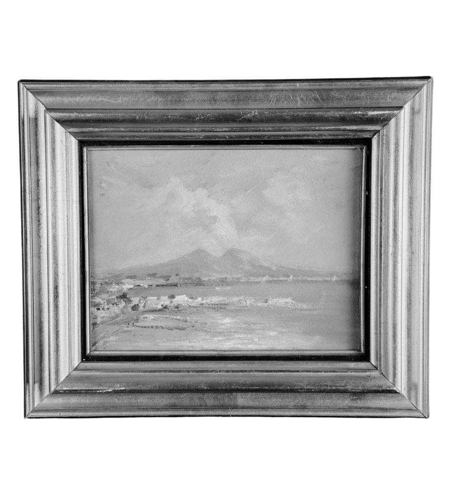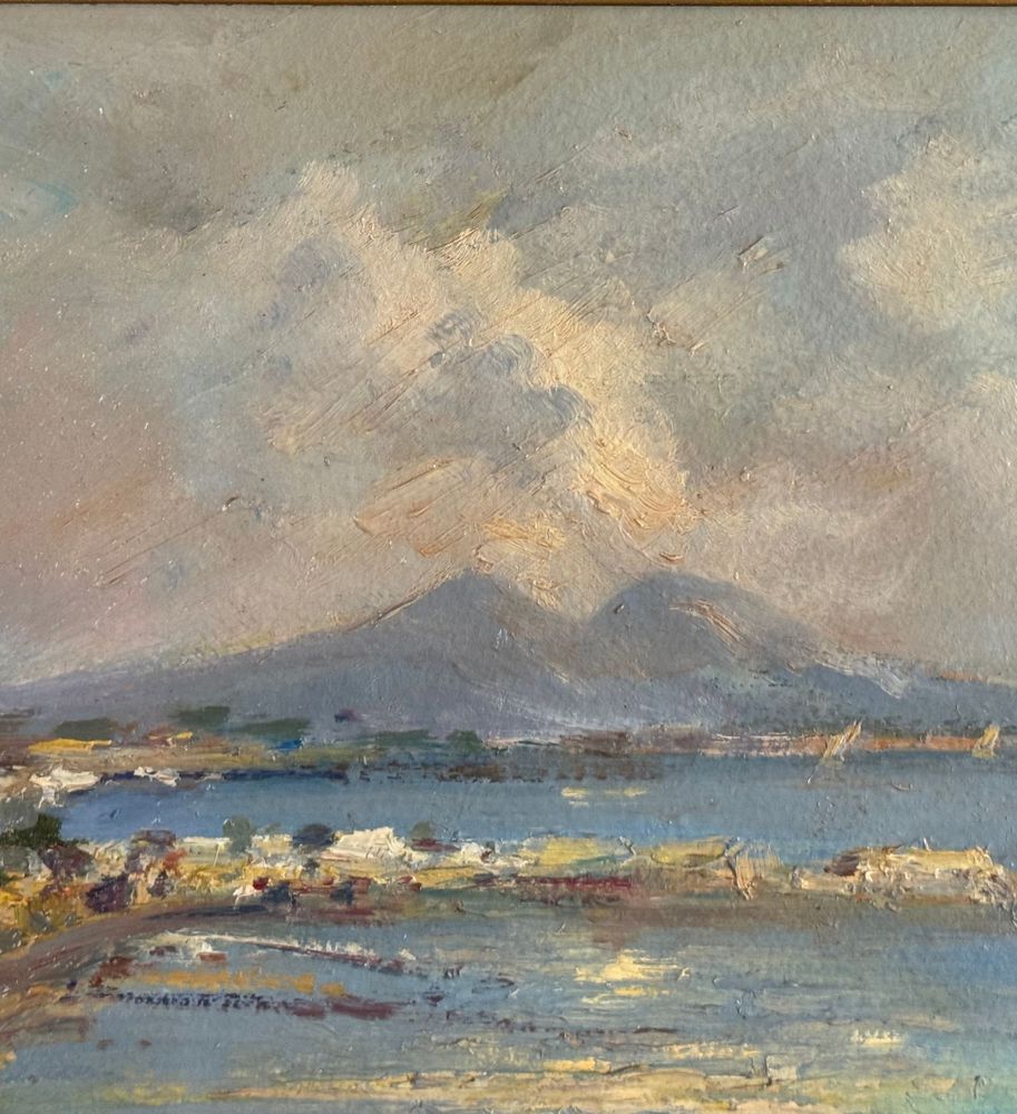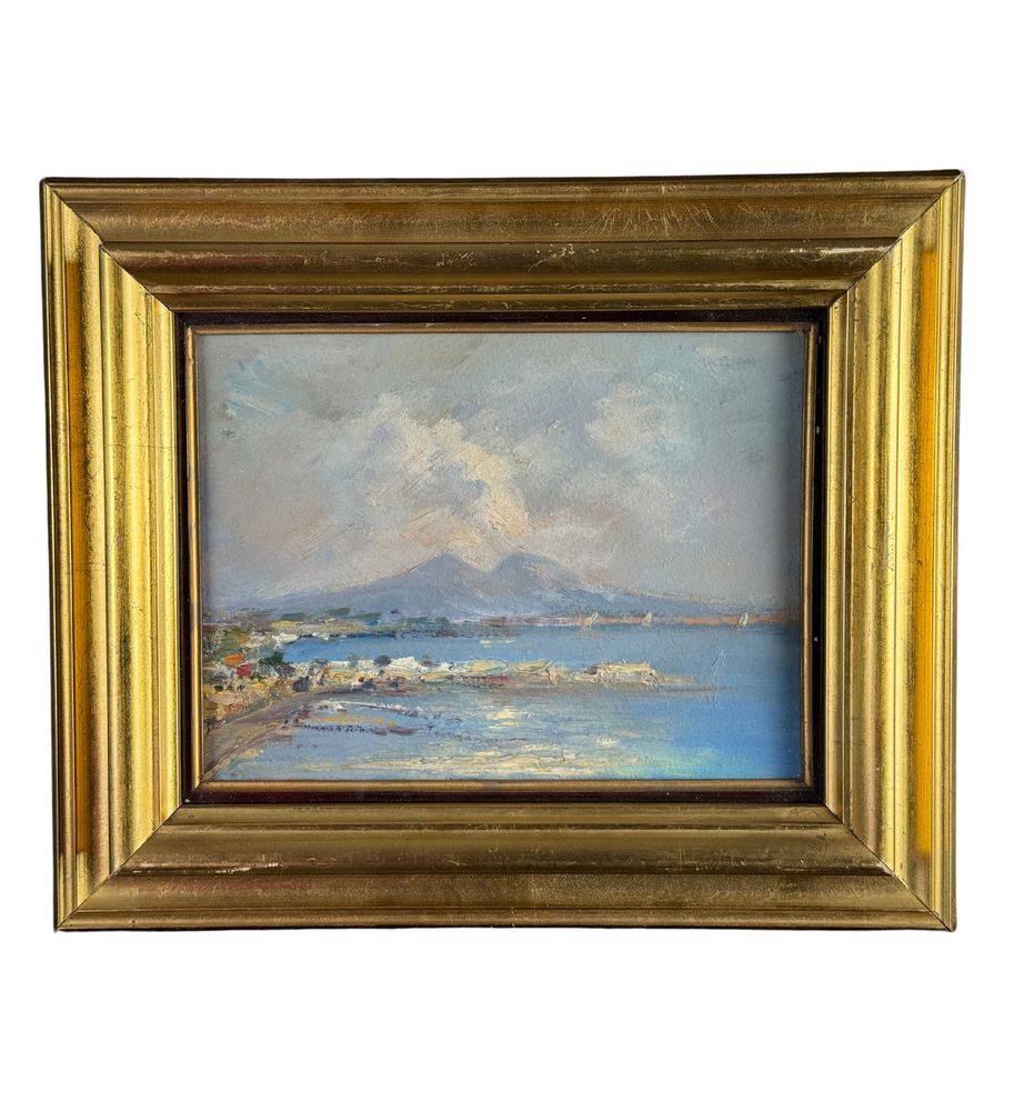 Dipinto olio su cartoncino, periodo prima metà del XX secolo scuola Italiana, raffigurante Scorcio di marina napoletana e Vesuvio. Dimensioni compreso cornice: 35x29 cm. Dimensioni interno cornice: 27x21 cm. Da artista anonimo. Opera in buone condizioni.