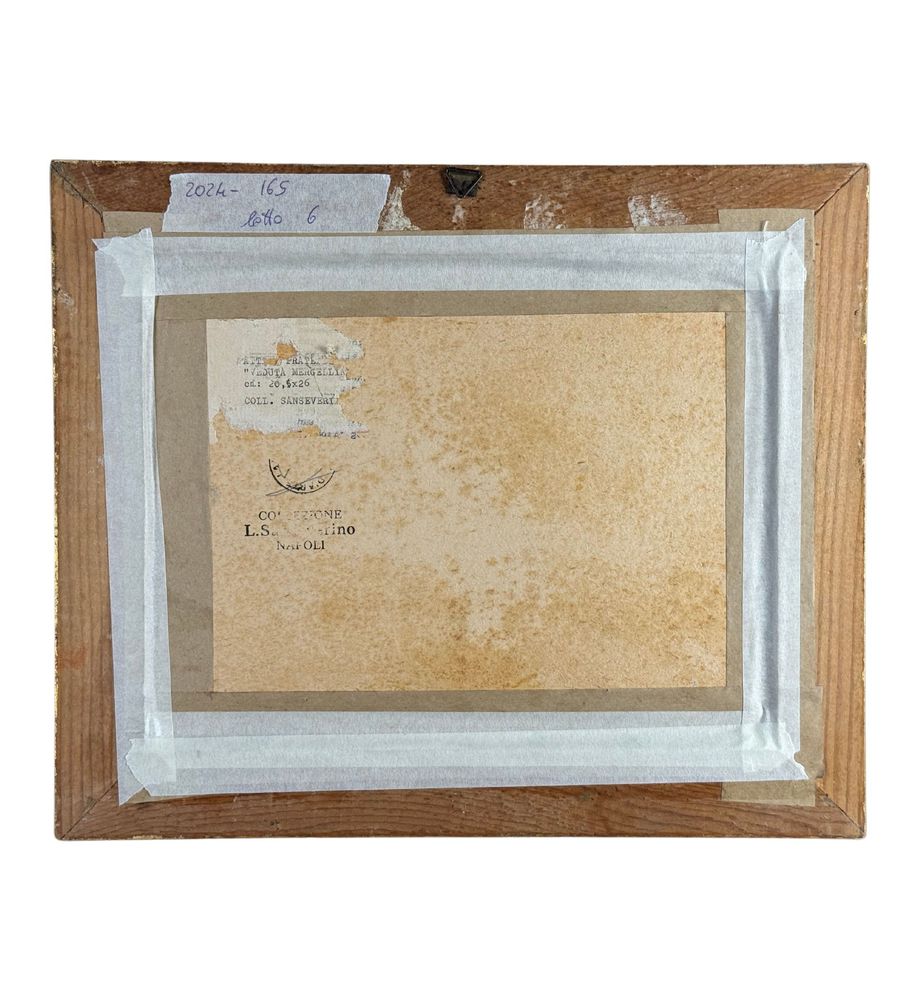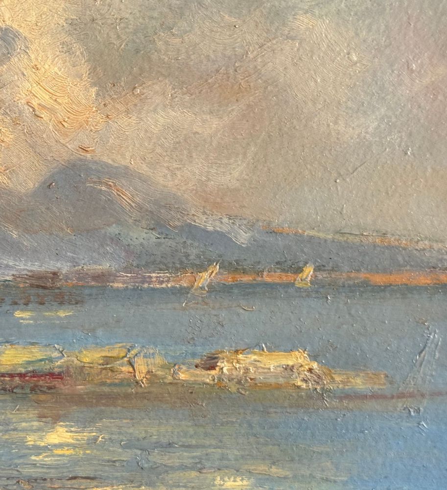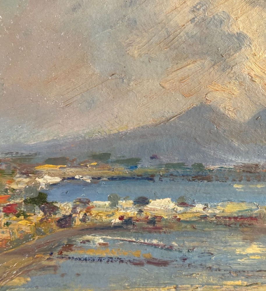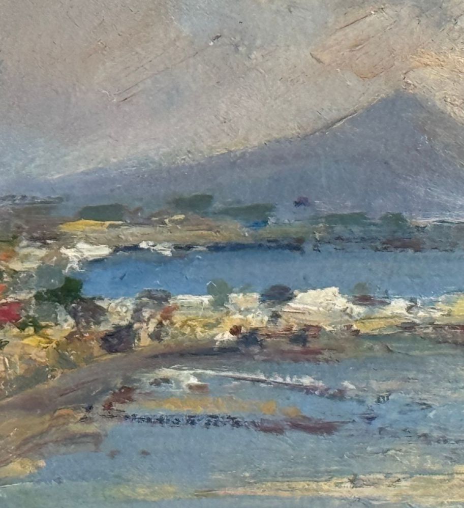 Dipinto olio su cartoncino, periodo prima metà del XX secolo scuola Italiana, raffigurante Scorcio di marina napoletana e Vesuvio. Dimensioni compreso cornice: 35x29 cm. Dimensioni interno cornice: 27x21 cm. Da artista anonimo. Opera in buone condizioni.