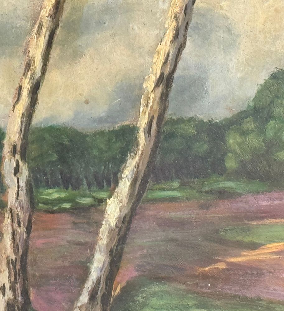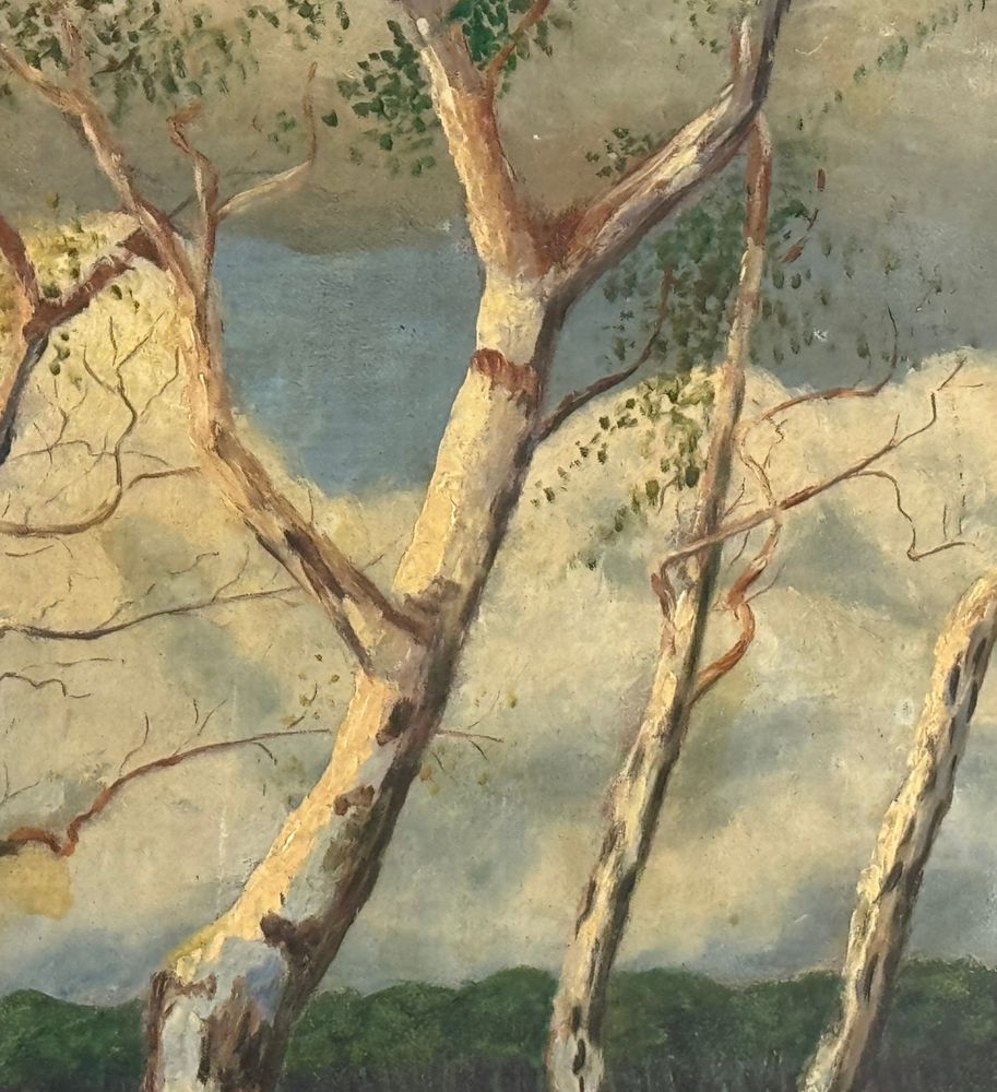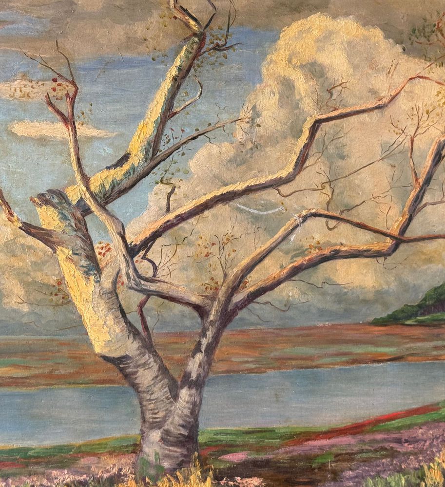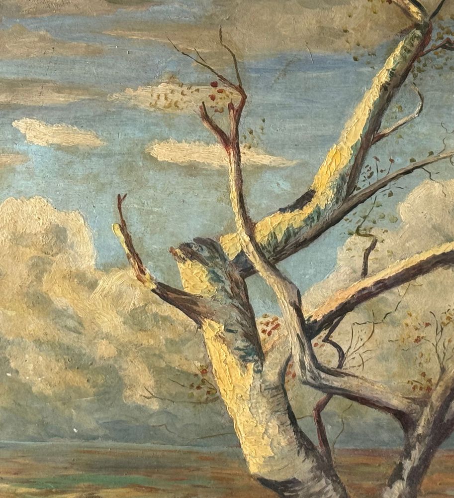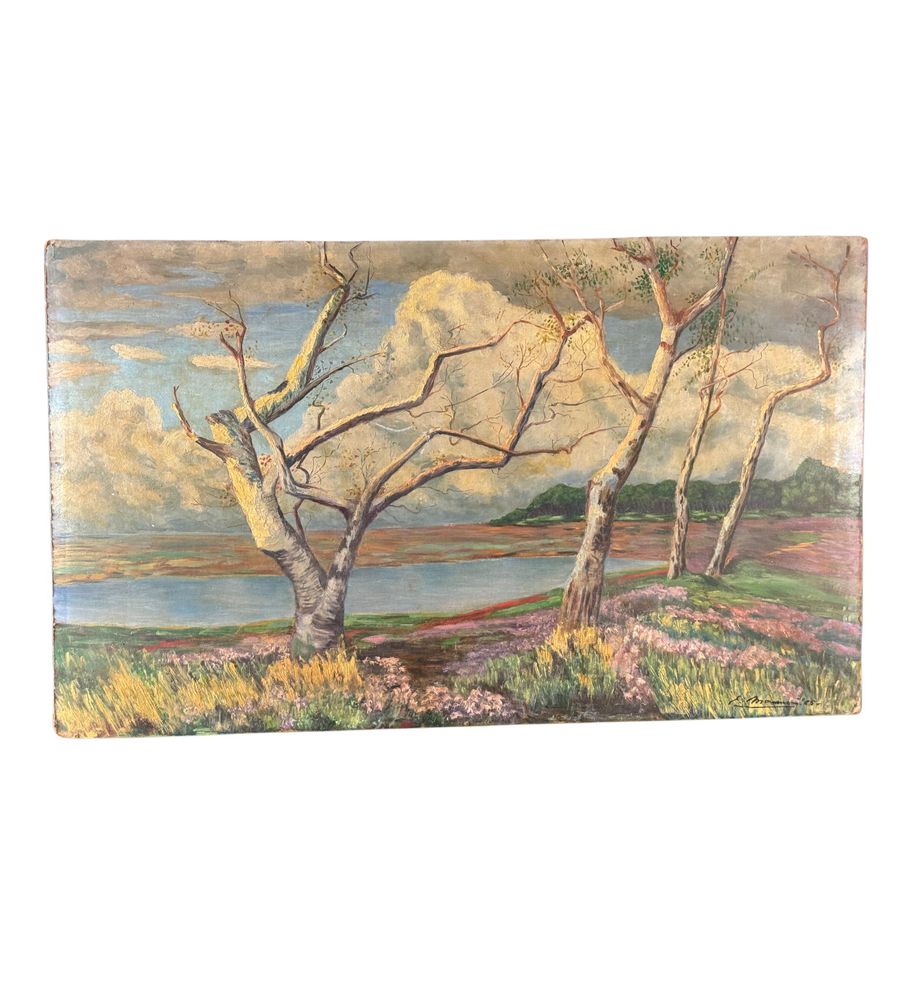 Dipinto olio su pannello, periodo XX secolo, raffigurante Paesaggio con alberi. Dimensioni: 70,5x42,5 cm. Reca firma in basso a destra da artista non identificato. Opera in buone condizioni.