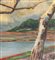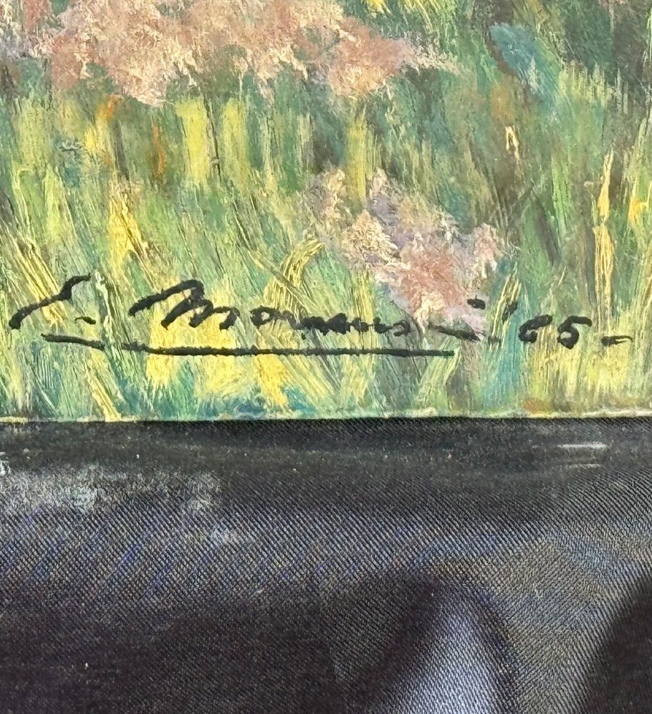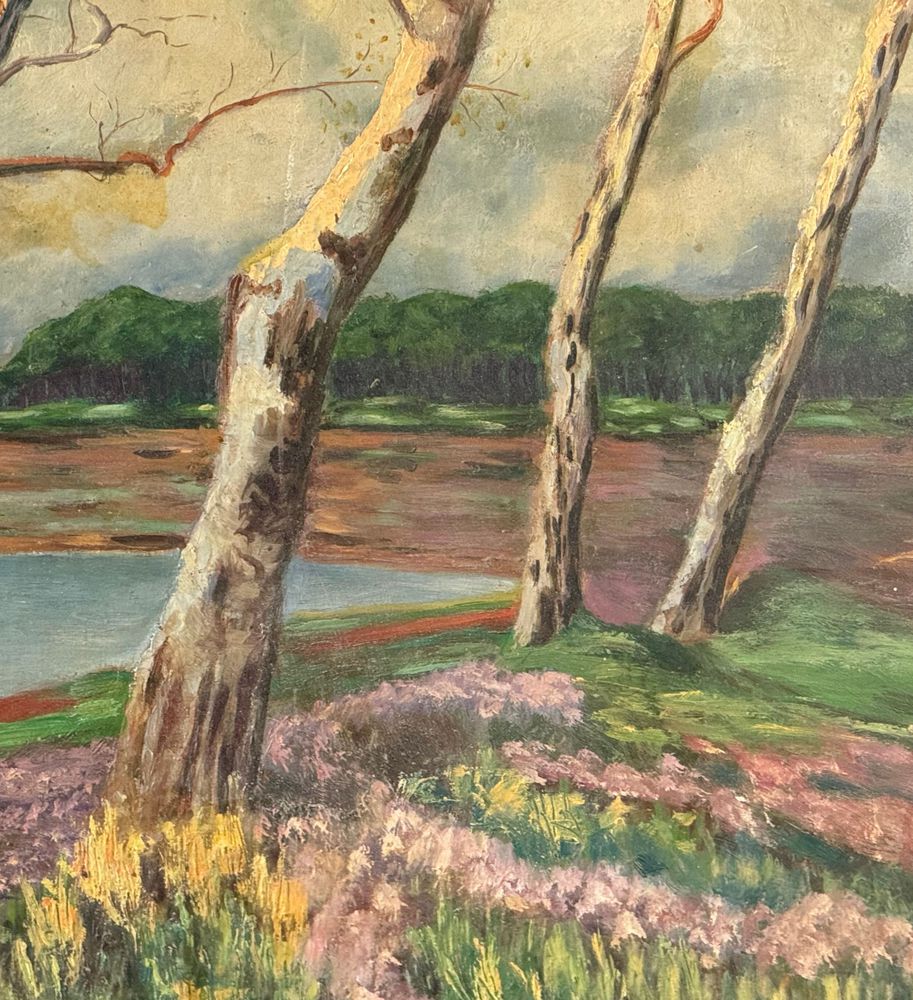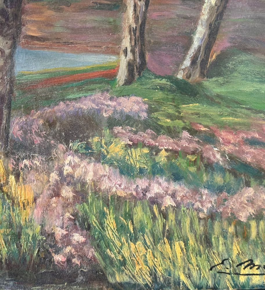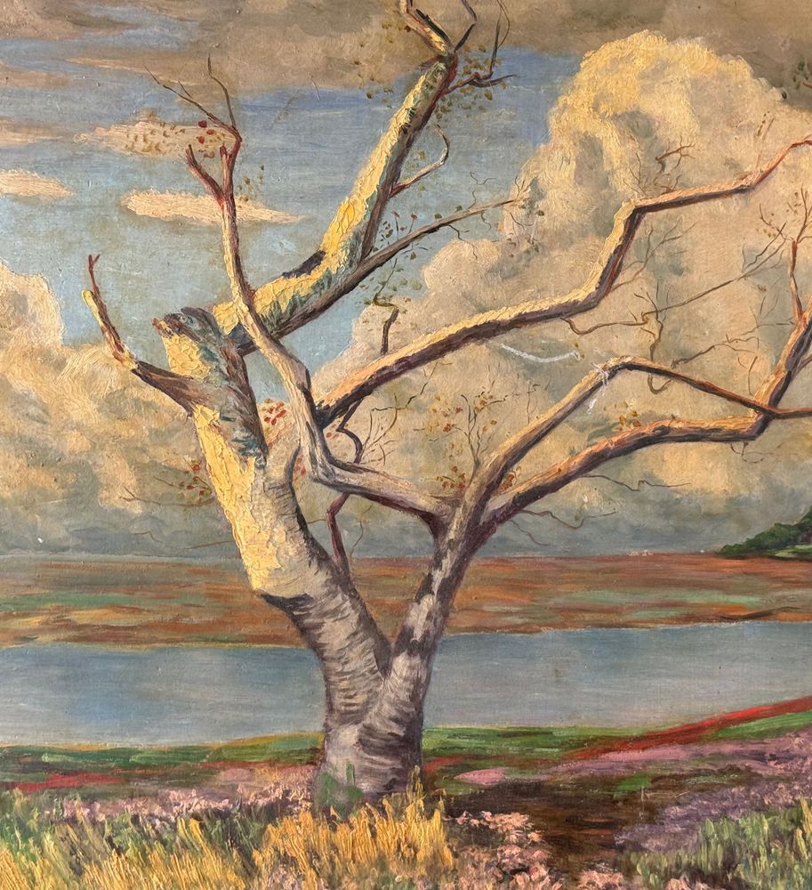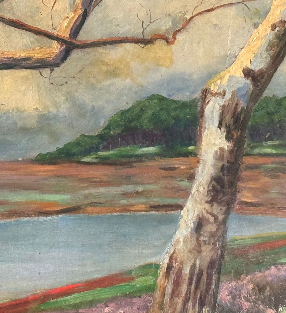 Dipinto olio su pannello, periodo XX secolo, raffigurante Paesaggio con alberi. Dimensioni: 70,5x42,5 cm. Reca firma in basso a destra da artista non identificato. Opera in buone condizioni.