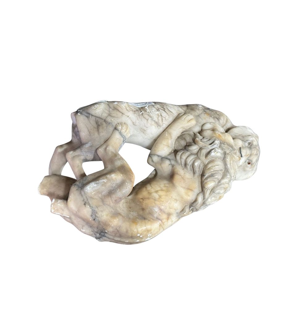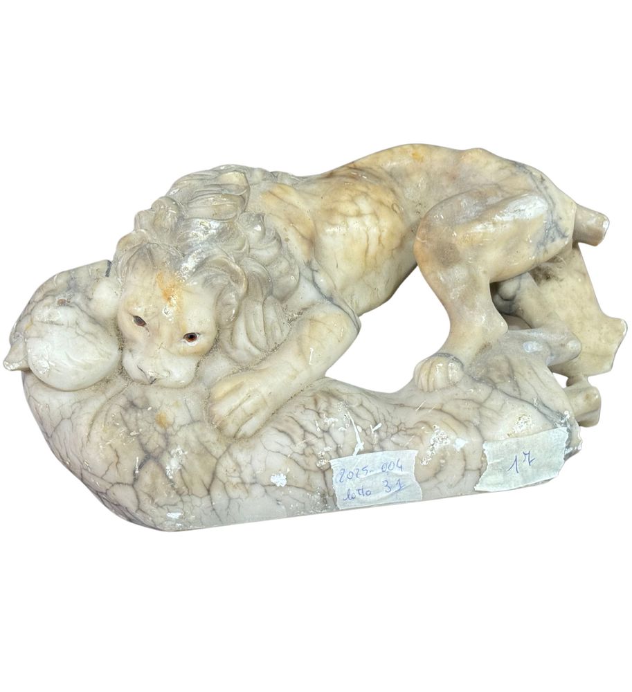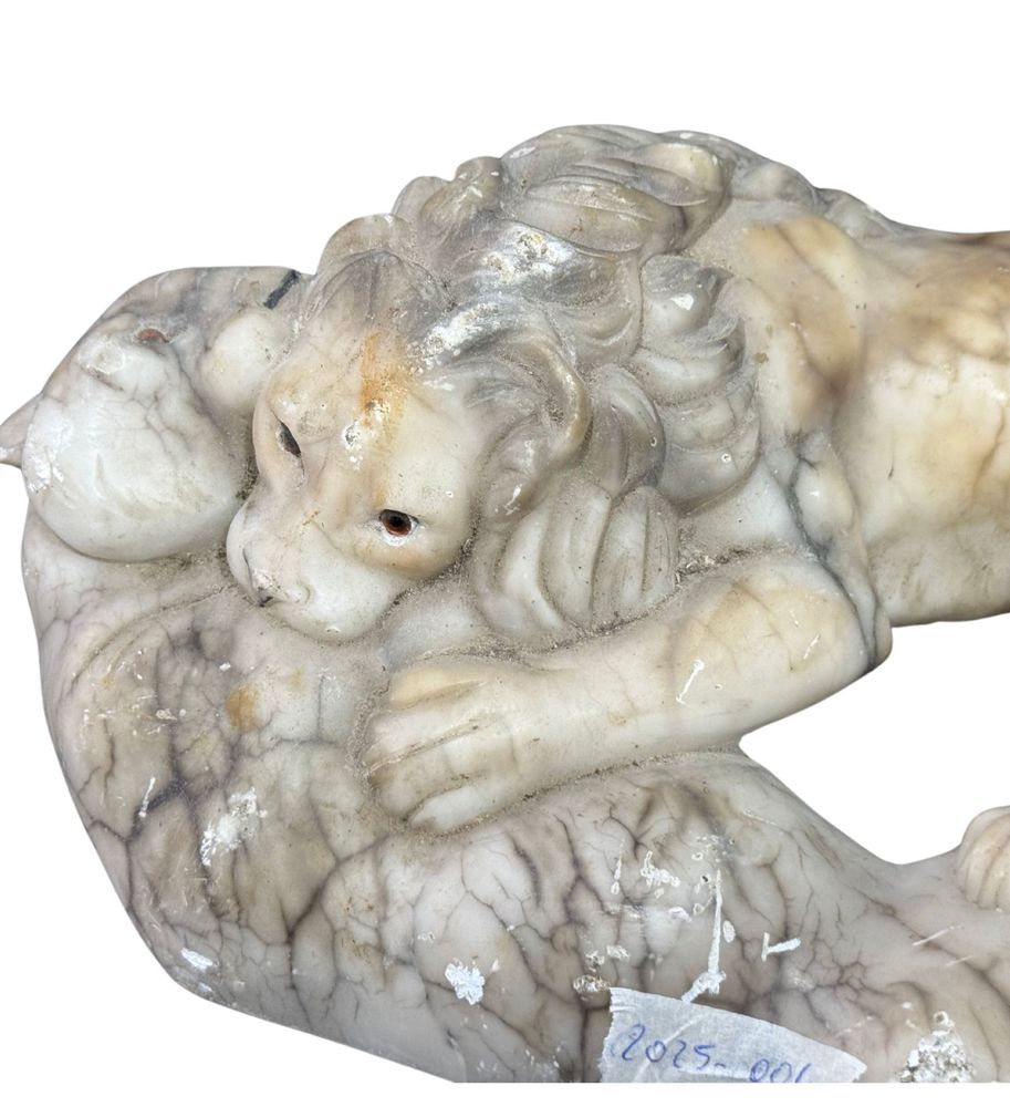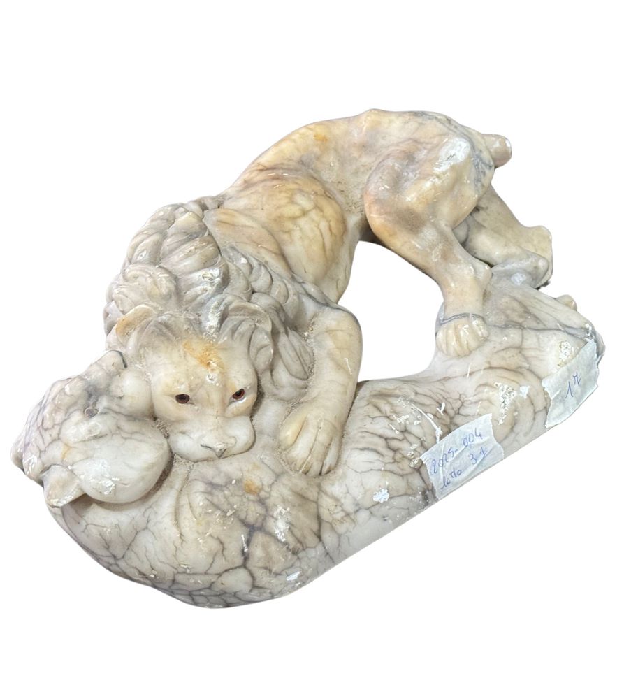 Scultura in marmo, periodo XIX secolo, raffigurante Coppia di leoni. Dimensioni: h18x34x12 cm. Scultura in discrete condizioni, segni di vissuto e mancanze come da foto allegate.