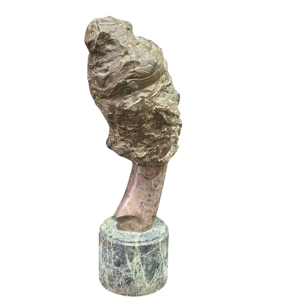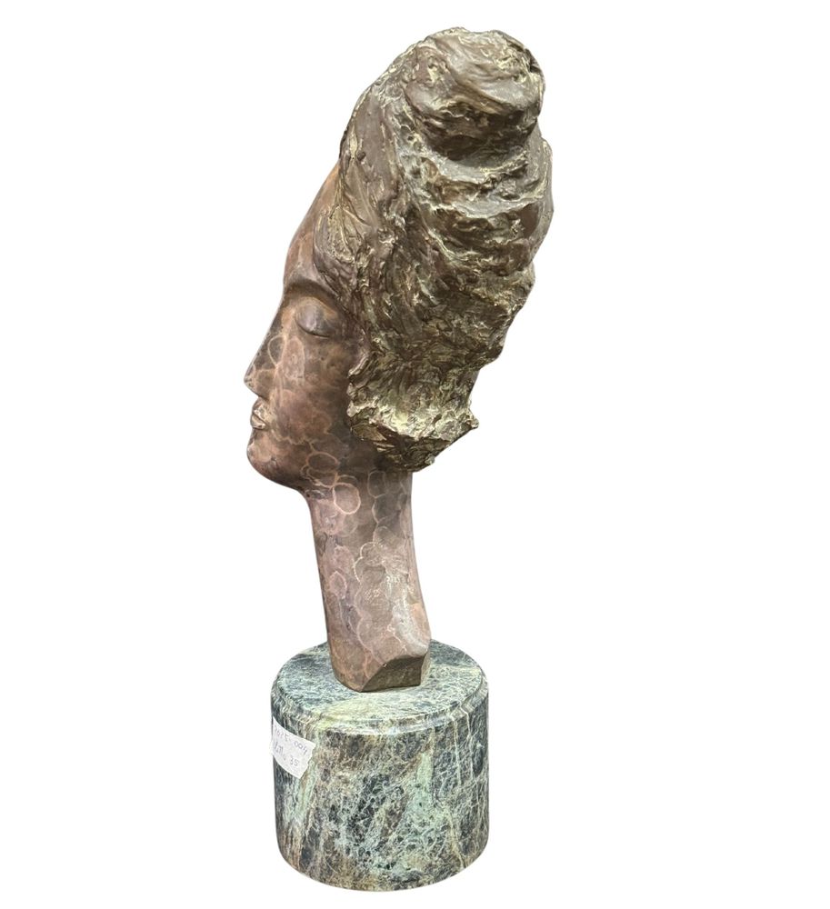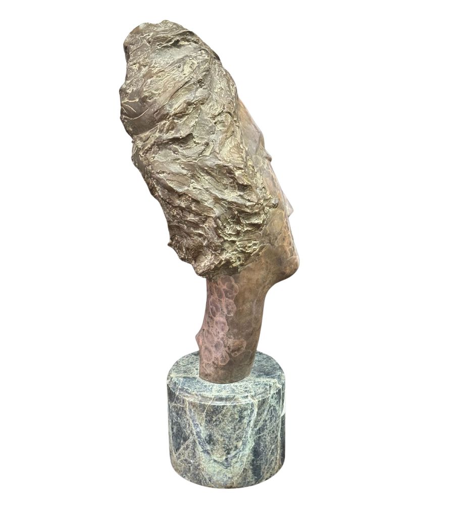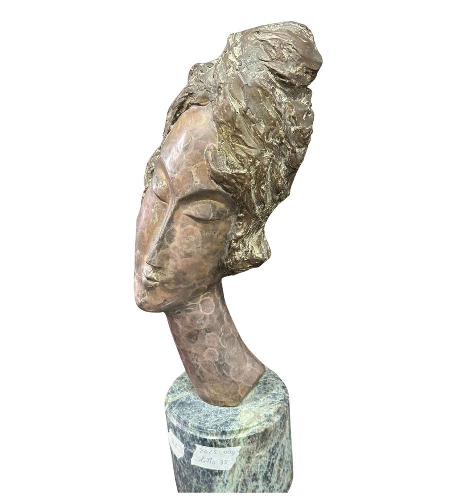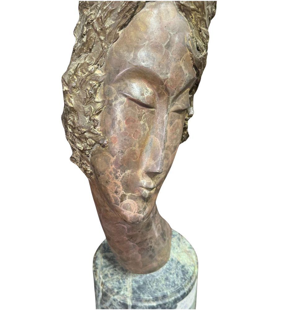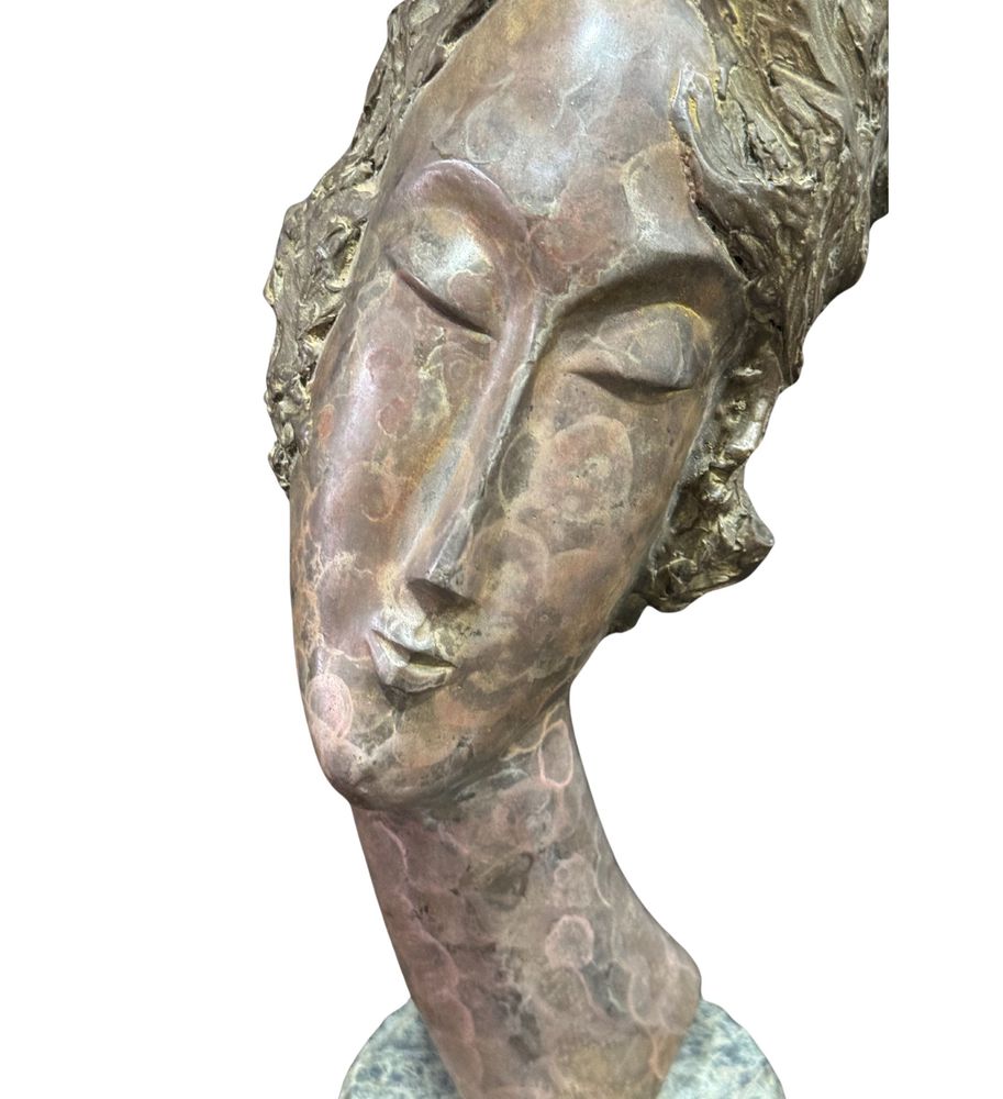 Scultura in bronzo a cera persa su base in marmo, periodo XX secolo, multiplo dal modello di Modigliani, raffigurante Volto di donna. Dimensioni: h47x12x17 cm. Scultura in buone condizioni.
