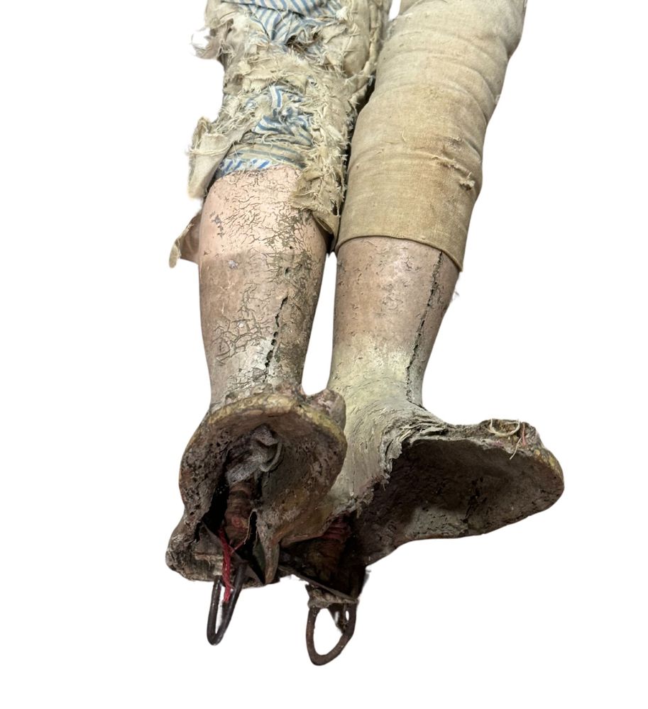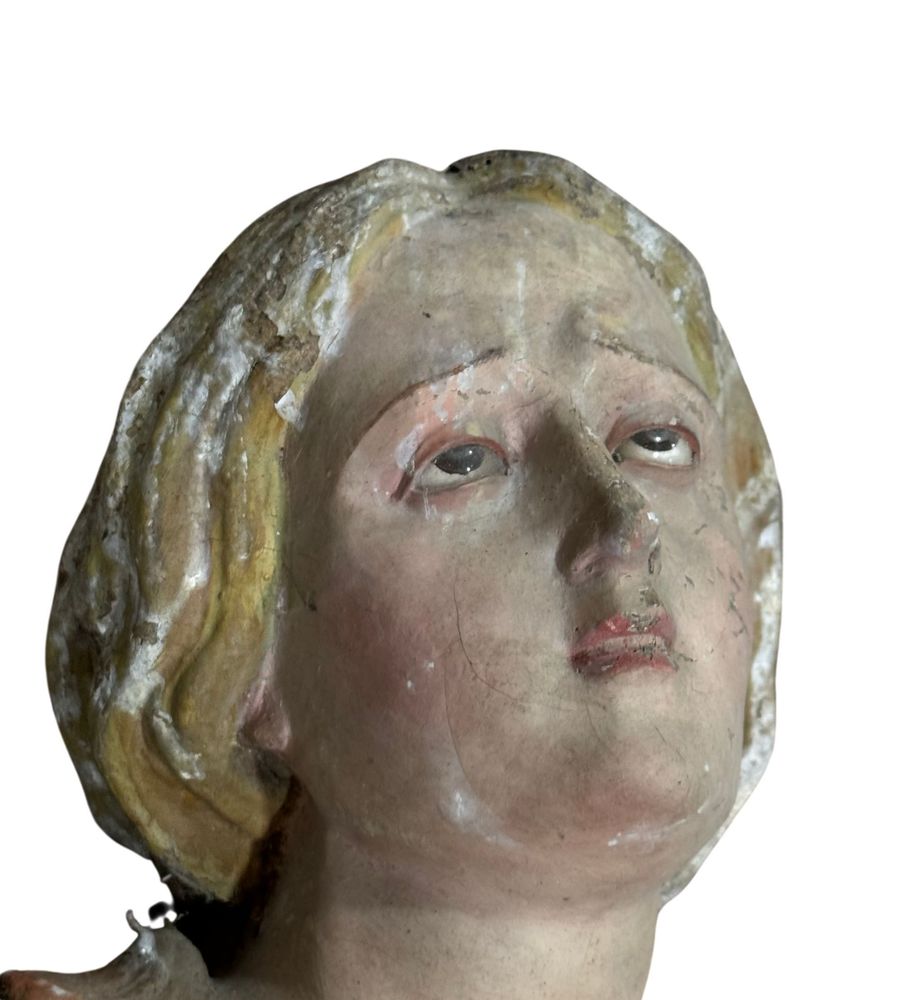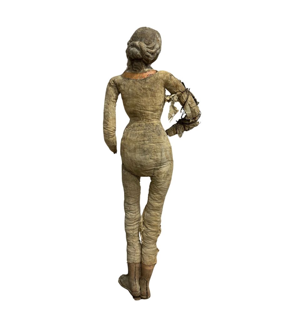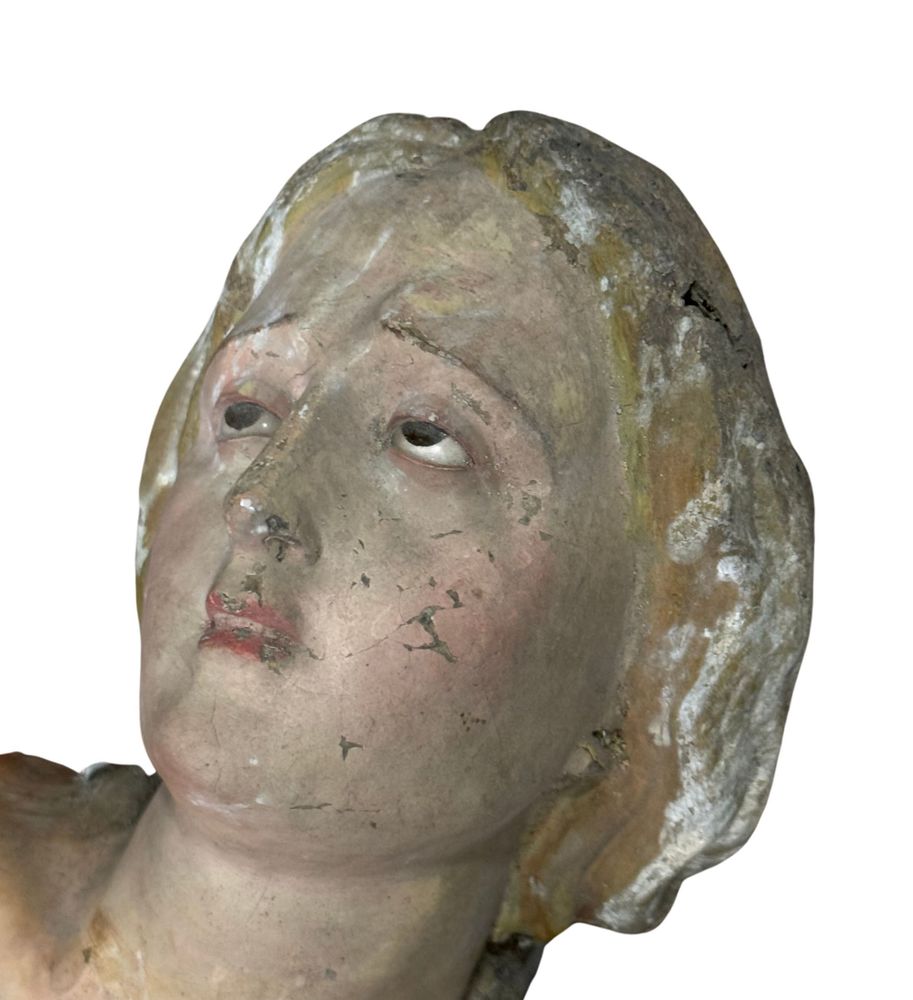 Scultura presepiale, periodo XVIII secolo, raffigurante Figura femminile. Così composta: corpo in canapa antica, testa e piedi in cartapesta, occhi in vetro. Dimensioni: h110 cm. Scultura in discrete condizioni, assenza delle mani, con vistosi segni di vissuto come da foto allegate.