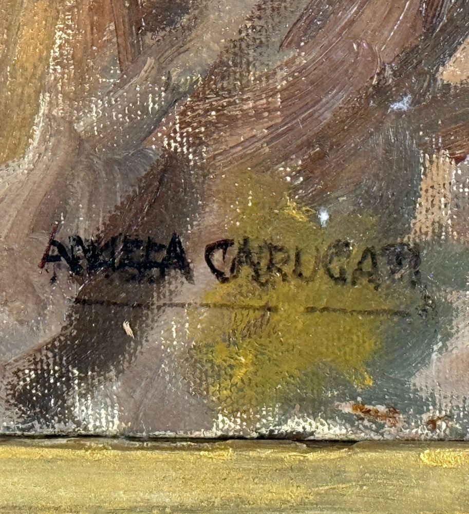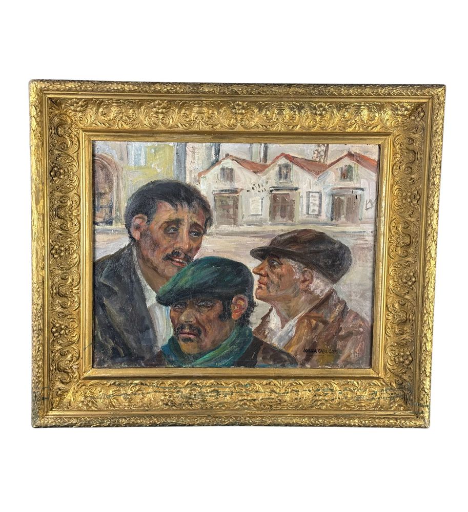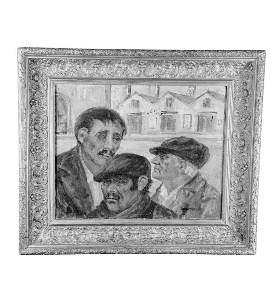 Dipinto olio su tela, periodo XX secolo scuola Italiana, raffigurante Tre personaggi. Dimensioni compreso cornice: 69x59 cm. Dimensioni interno cornice: 50x40 cm. Reca firma in basso a destra da Angela Carugati. Opera in buone condizioni.