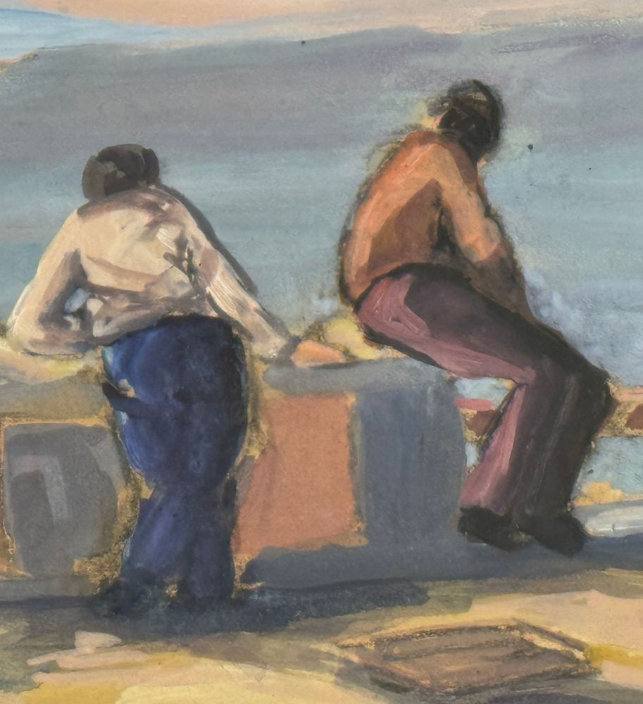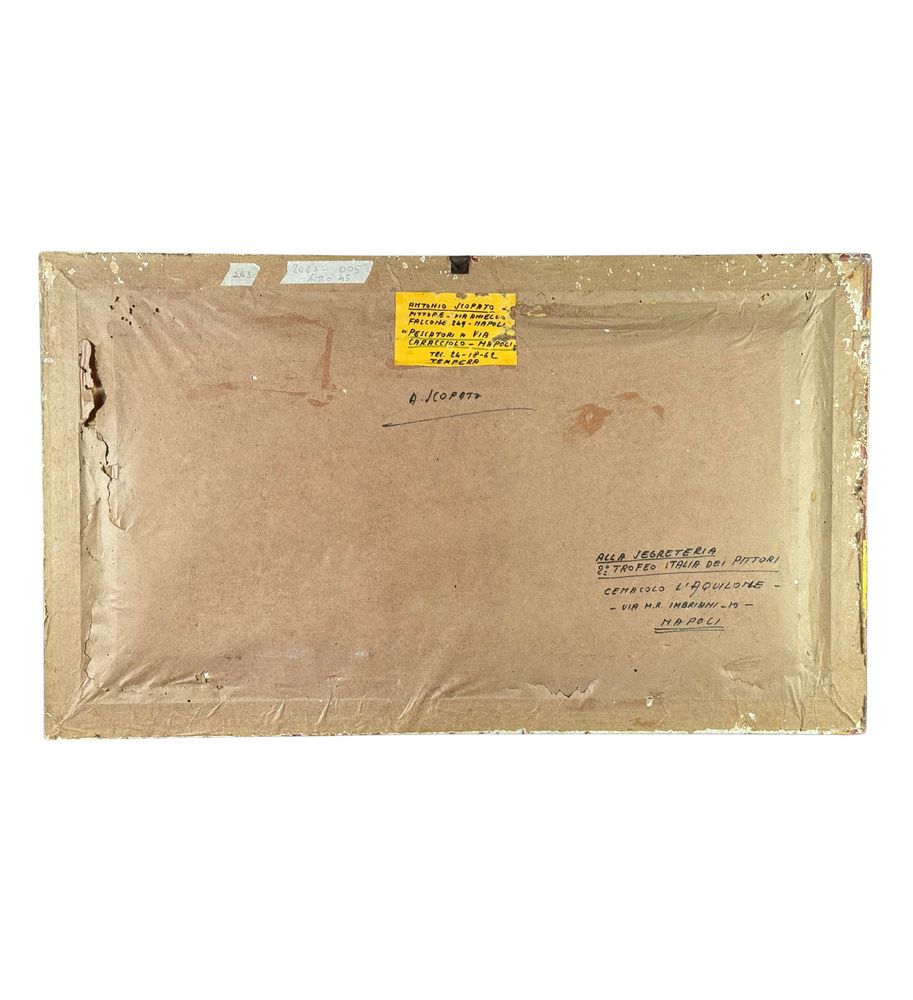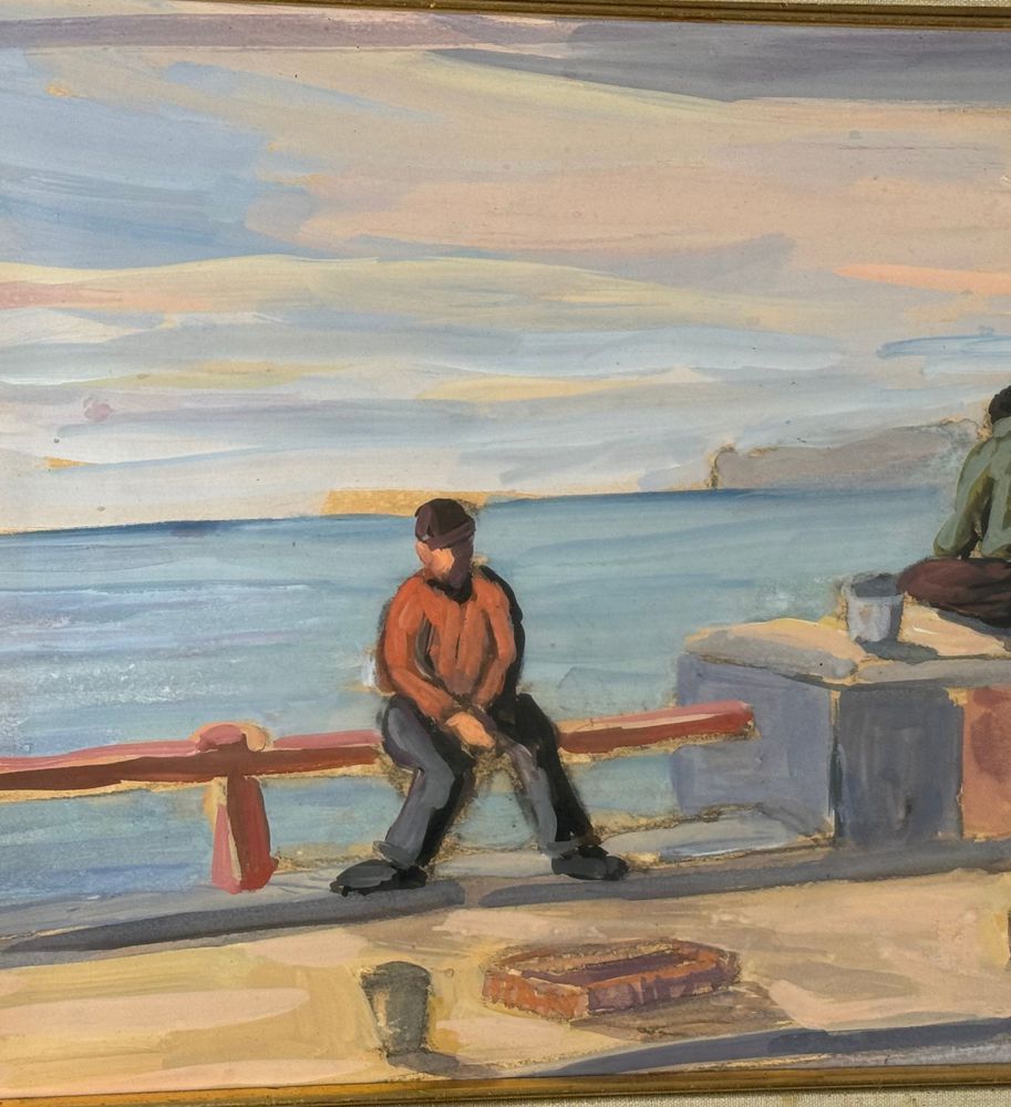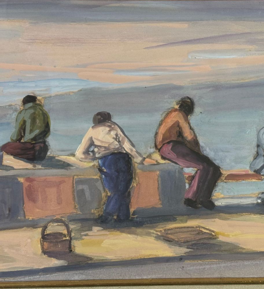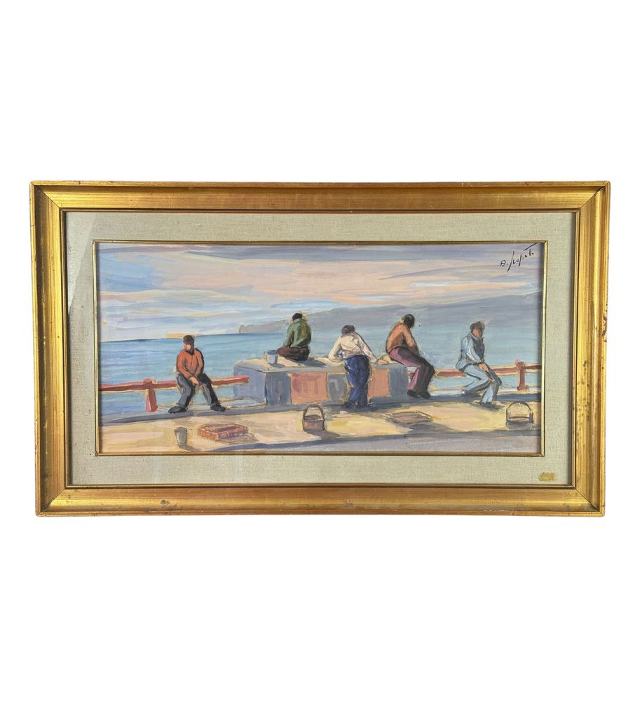 Tempera su carta, periodo XX secolo scuola Italiana, raffigurante Pescatori a Via Caracciolo. Dimensioni compreso cornice: 94x55 cm. Dimensioni interno cornice: 75x36 cm. Reca firma in alto a destra Antonio Scopato. Opera in buone condizioni.
