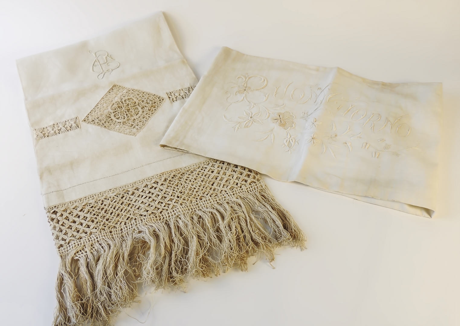 LOTTO DI BIANCHERIA fine del XIX/inizio del XX secolo composto da set matrimoniale con buttalà e coppia di federe in lino finemente ricamate con iscrizione fiorita Buon Giorno e Buon Riposo, due coppie di federe ricamate con monogramma e applicazioni di merletti e tre asciugamani in Fiandra con bordura a frangia (10)