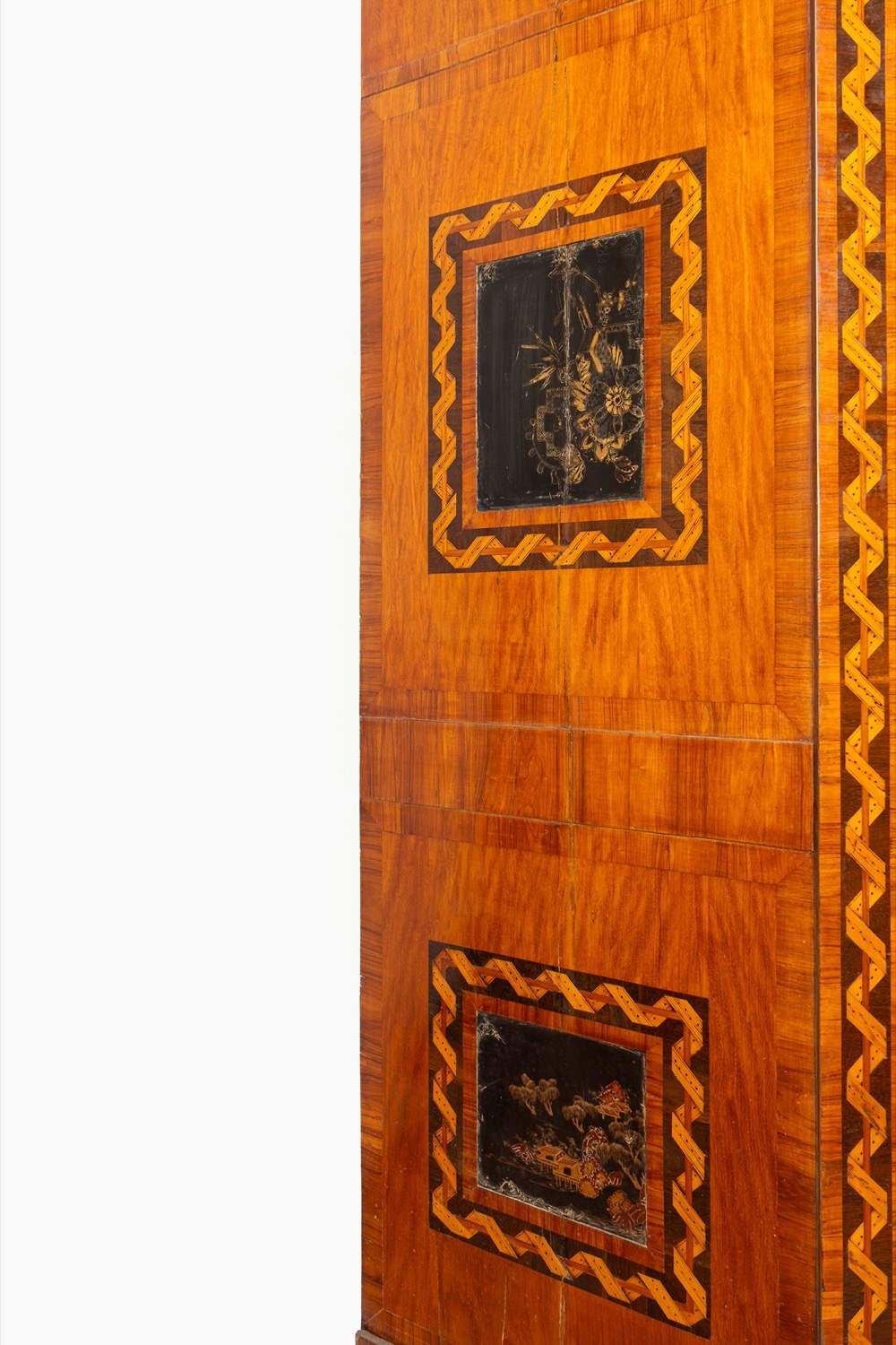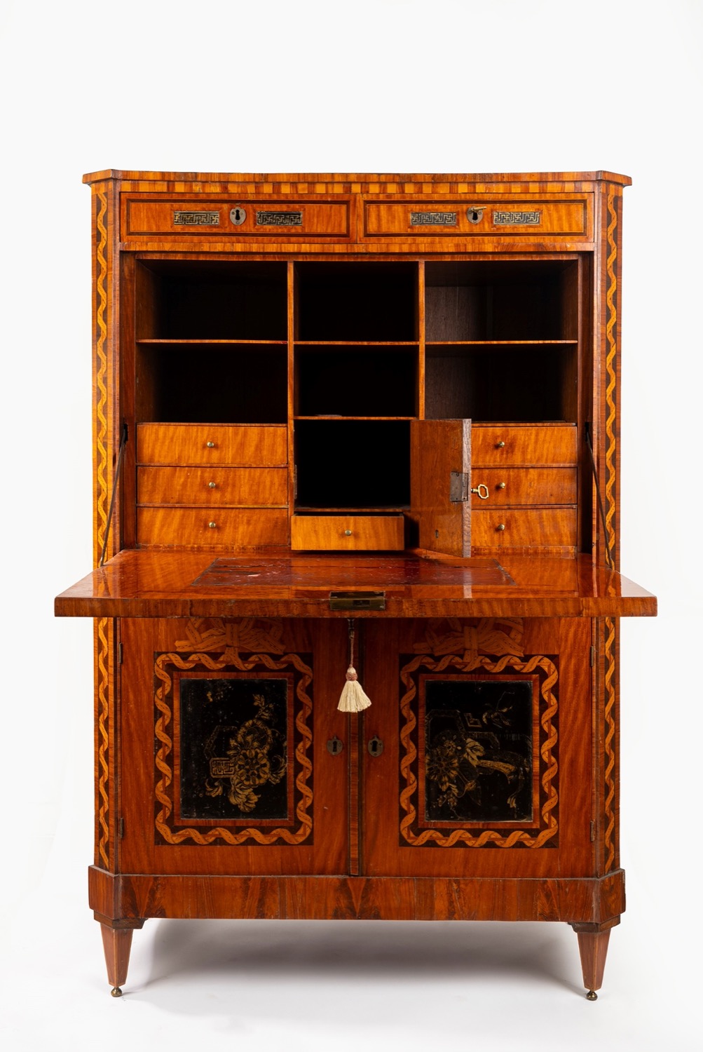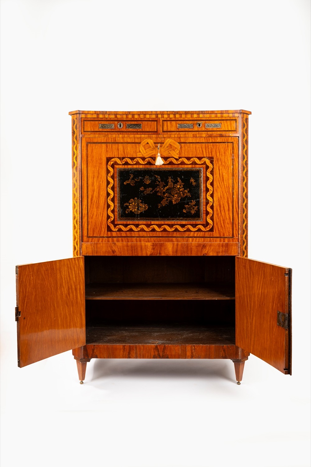 lastronato in satinwood, bois de rose e altre pregiate essenze, il fronte ad angoli smussati con due tiretti sottopiano, la calatoia centrata da pannello laccato e celante sei tiretti, un'antina e scomparti; due sportelli con pannelli laccati celanti ripiano, piedi troncopiramidali. Olanda, fine secolo XVIII/inizio secolo XIXlastronato in satinwood, bois de rose e altre pregiate essenze, il fronte ad angoli smussati con due tiretti sottopiano, la calatoia centrata da pannello laccato e celante sei tiretti, un'antina e scomparti; due sportelli con pannelli laccati celanti ripiano, piedi troncopiramidali. Olanda, fine secolo XVIII/inizio secolo XIX