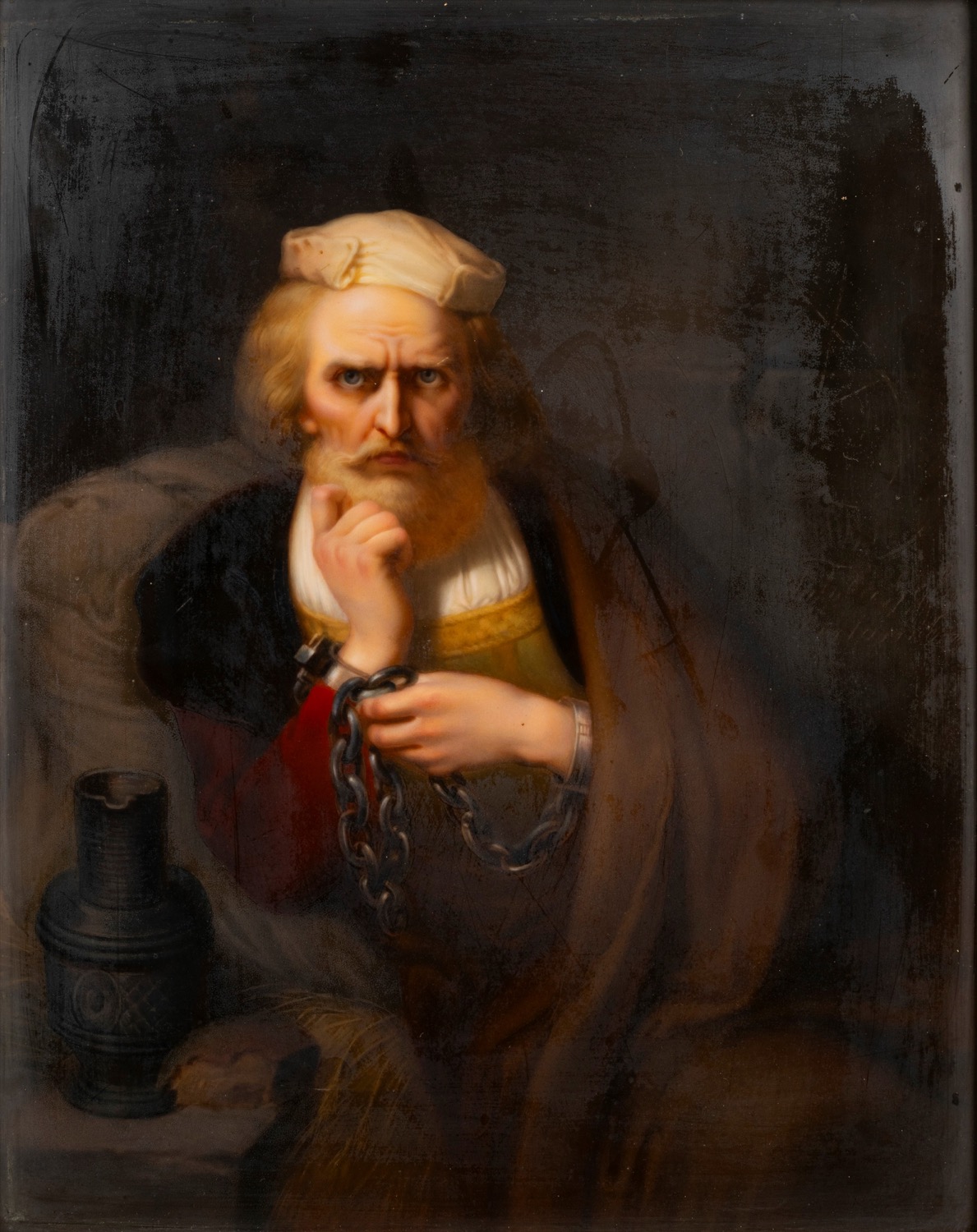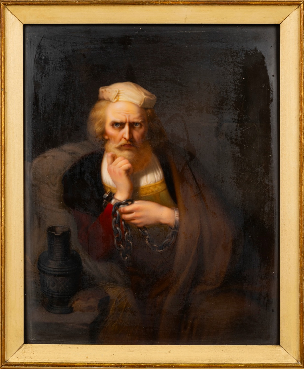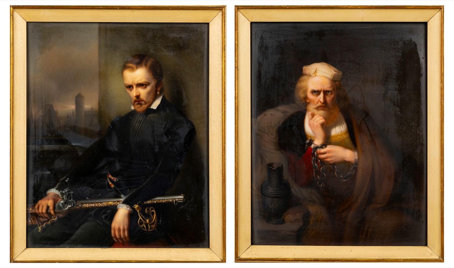 Numeri di serie 12.9 3/4 sul retro di entrambe, marchio KPM impresso sul retro della formella con Carlo IX raffiguranti "Cristoforo Colombo in catene" da un dipinto di Gustaaf Wappers (1803-1874) e "Carlo IX la notte di San Bartolomeo" da un dipinto di Emil Jacobs (1802 - 1866).