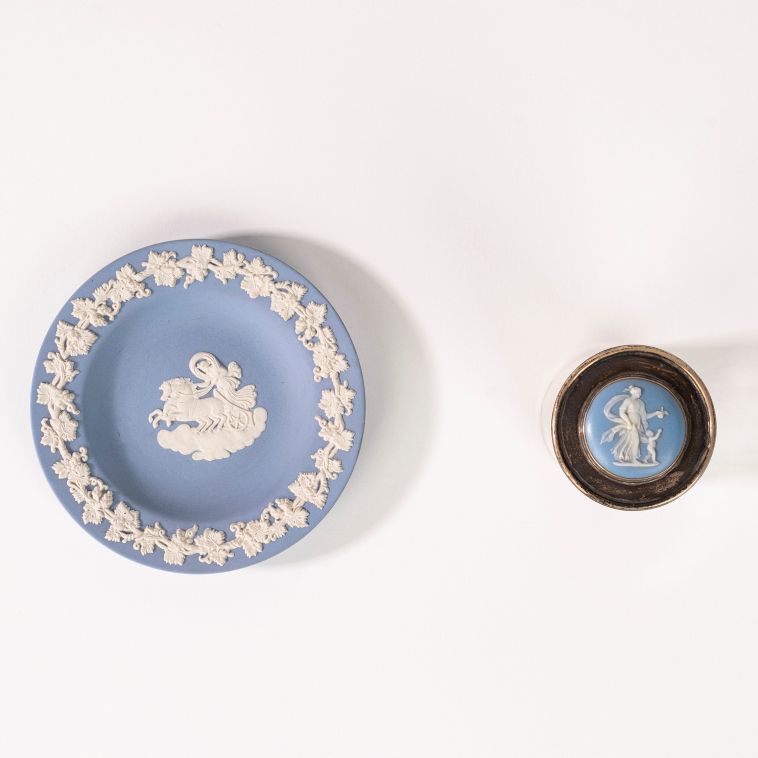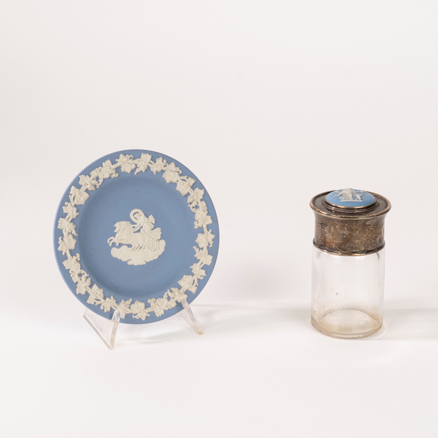 la boccetta in vetro con tappo in argento con punzone di Chester e placca in jasperware a fondo azzurro decorata con figure bianche classiche a rilievo; il piatto decorato nel cavetto con scena classica e nella tesa con tralci di vitela boccetta in vetro con tappo in argento con punzone di Chester e placca in jasperware a fondo azzurro decorata con figure bianche classiche a rilievo; il piatto decorato nel cavetto con scena classica e nella tesa con tralci di vite