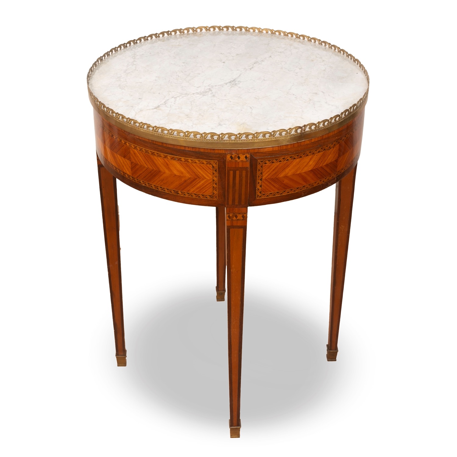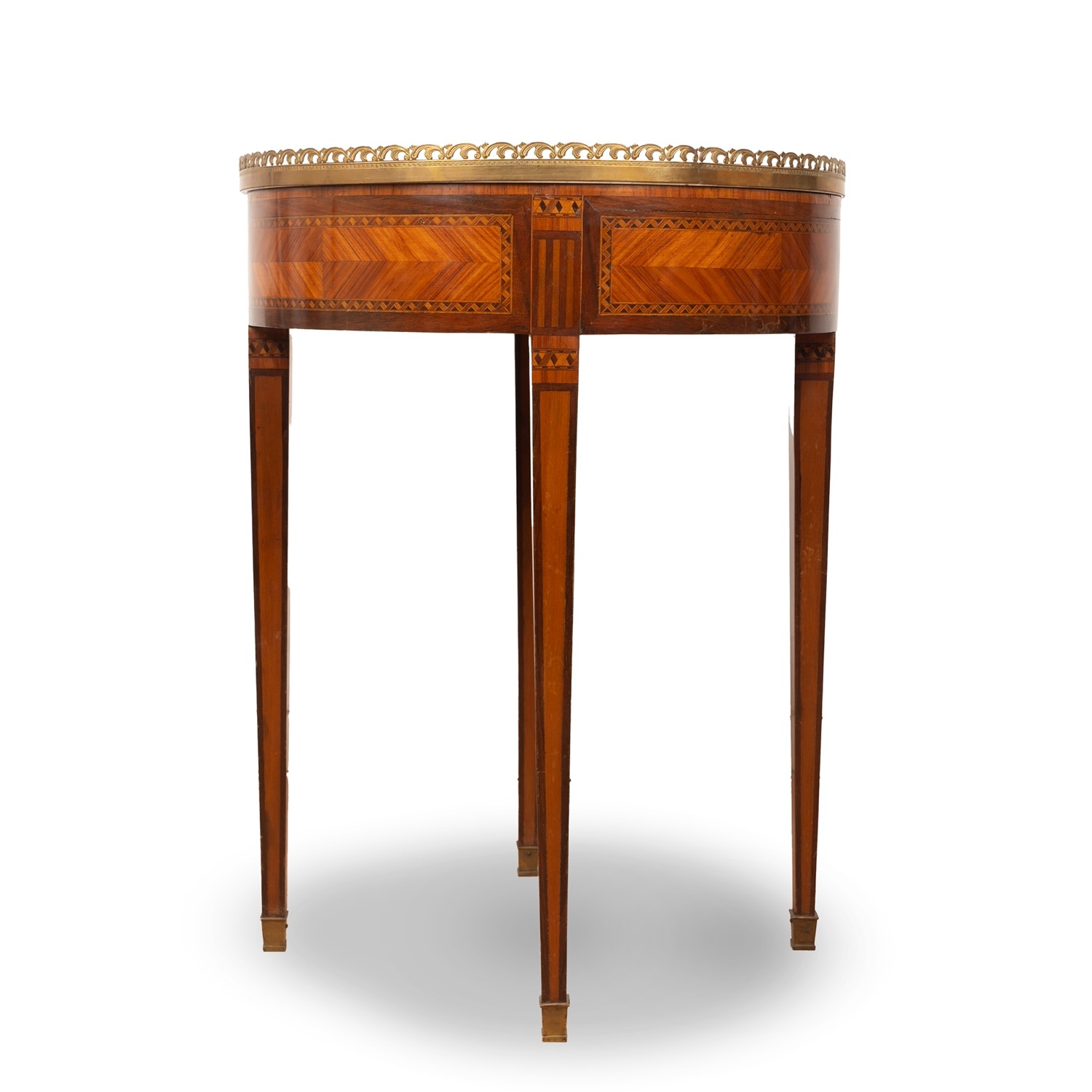 lastronato e intarsiato, con gambe rastremate, piano in marmo e ringhiera traforata in bronzo doratolastronato e intarsiato, con gambe rastremate, piano in marmo e ringhiera traforata in bronzo dorato