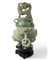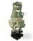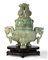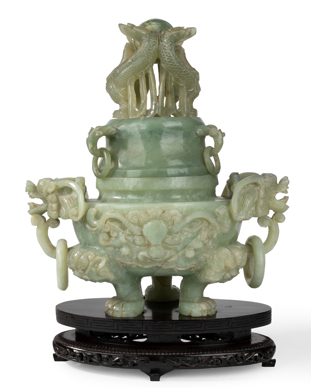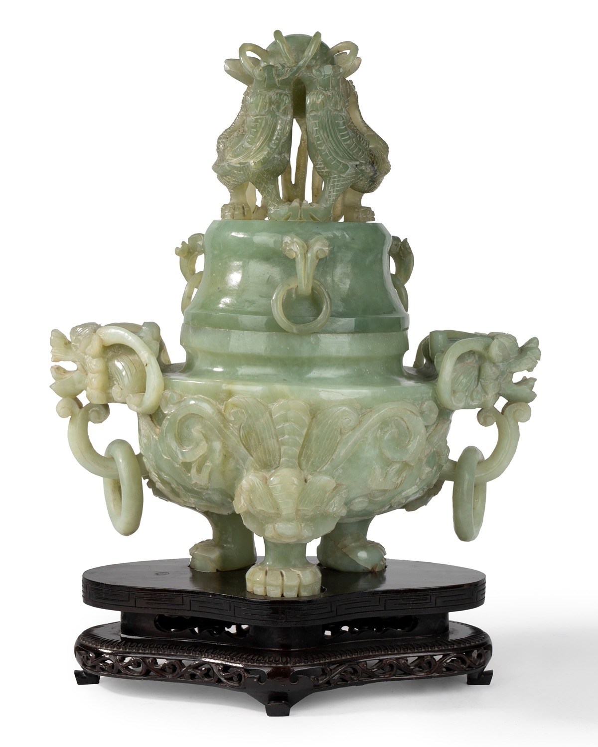 Tripode con mascheroni e anelli in pietra verde su base in legno modanata, Cina secolo XX