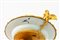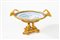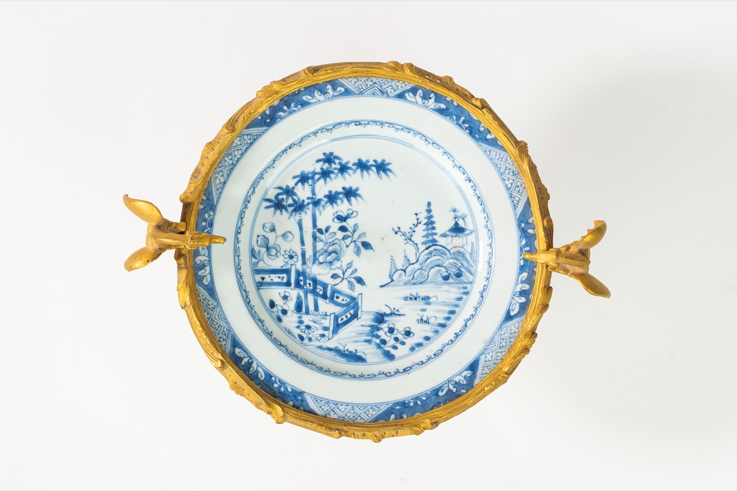 base in bronzo dorato con tre delfini e prese a forma di draghi, piatto in porcellana bianca e blu raffigurante paesaggio orientalebase in bronzo dorato con tre delfini e prese a forma di draghi, piatto in porcellana bianca e blu raffigurante paesaggio orientale