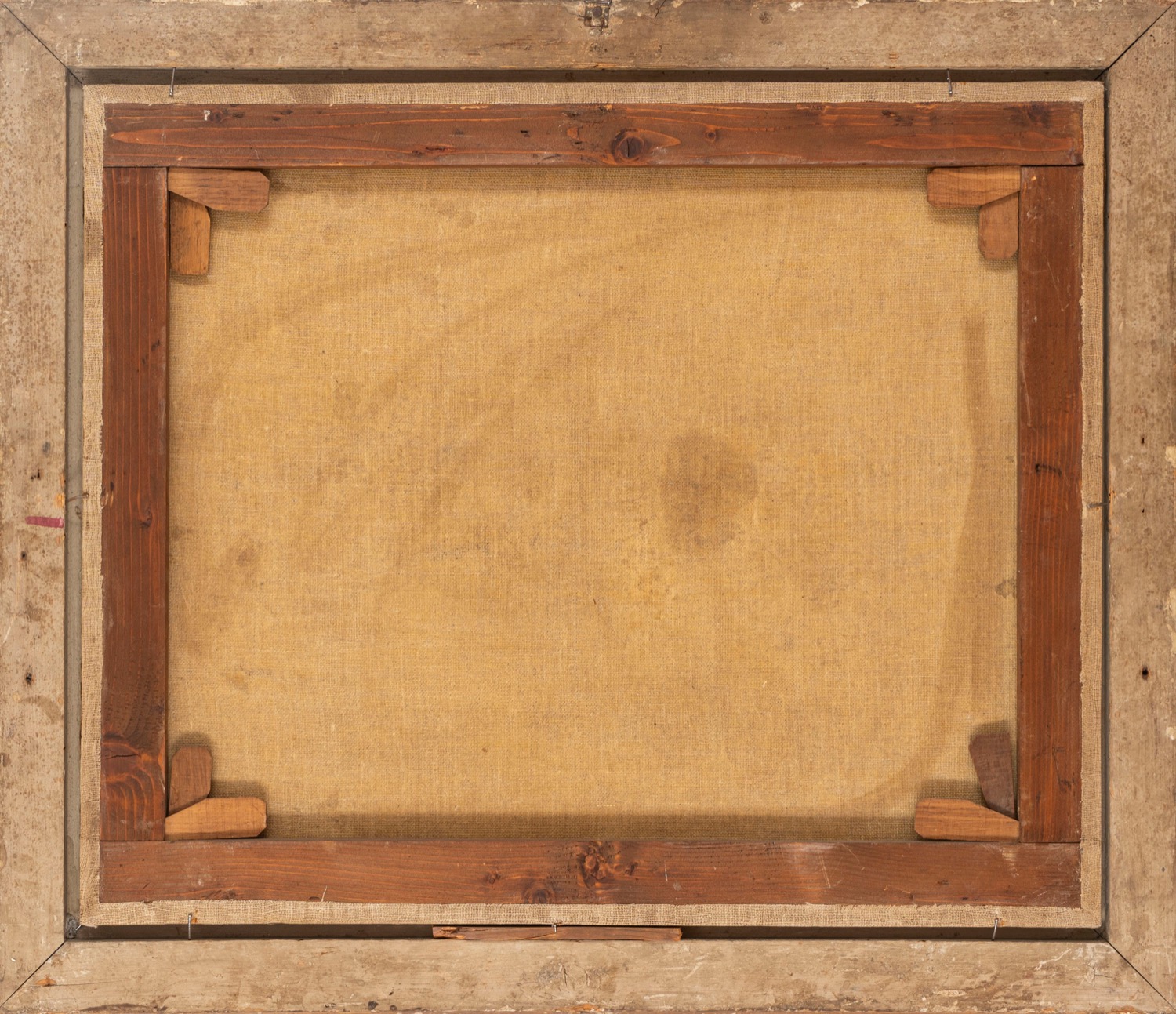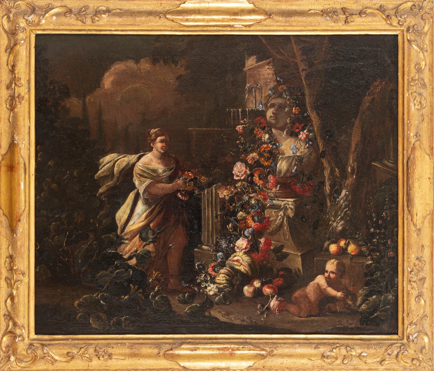 Scuola napoletana, secolo XVIII - Trionfo di fiori e frutti in un giardino con donna che adorna una statua