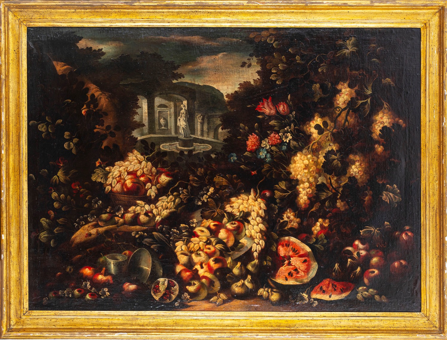 Lotto 273 | Maniera di Abraham Brueghel - Trionfo di fiori e frutta en plein air