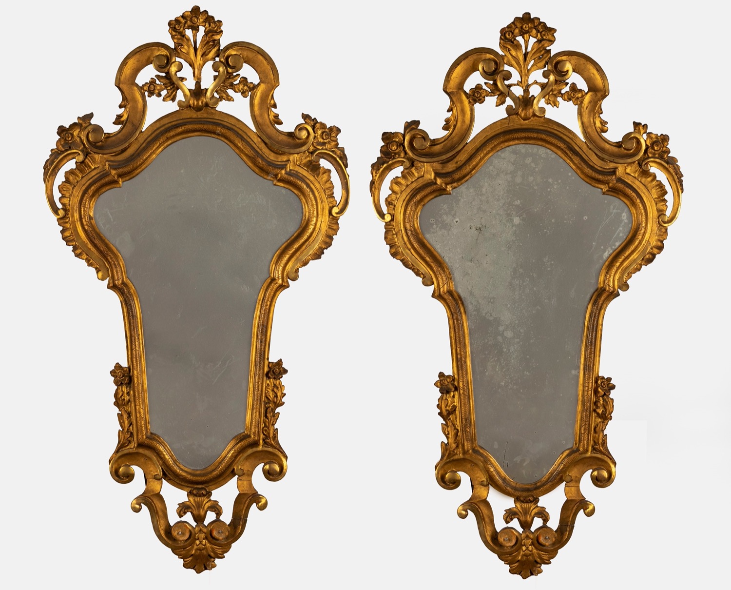 in legno intagliato e dorato, di forma sagomata con fregi a volute di foglie e fiori, cimasa traforata (difetti e restauri)in legno intagliato e dorato, di forma sagomata con fregi a volute di foglie e fiori, cimasa traforata (difetti e restauri)