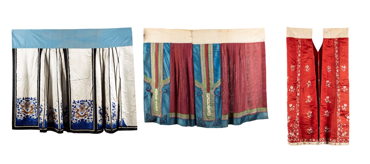 Lotto 314 | Tre gonne in seta, tra cui una a fondo bianco, una a fondo rosso, e una a fondo mattone, China, late Qing dynasty