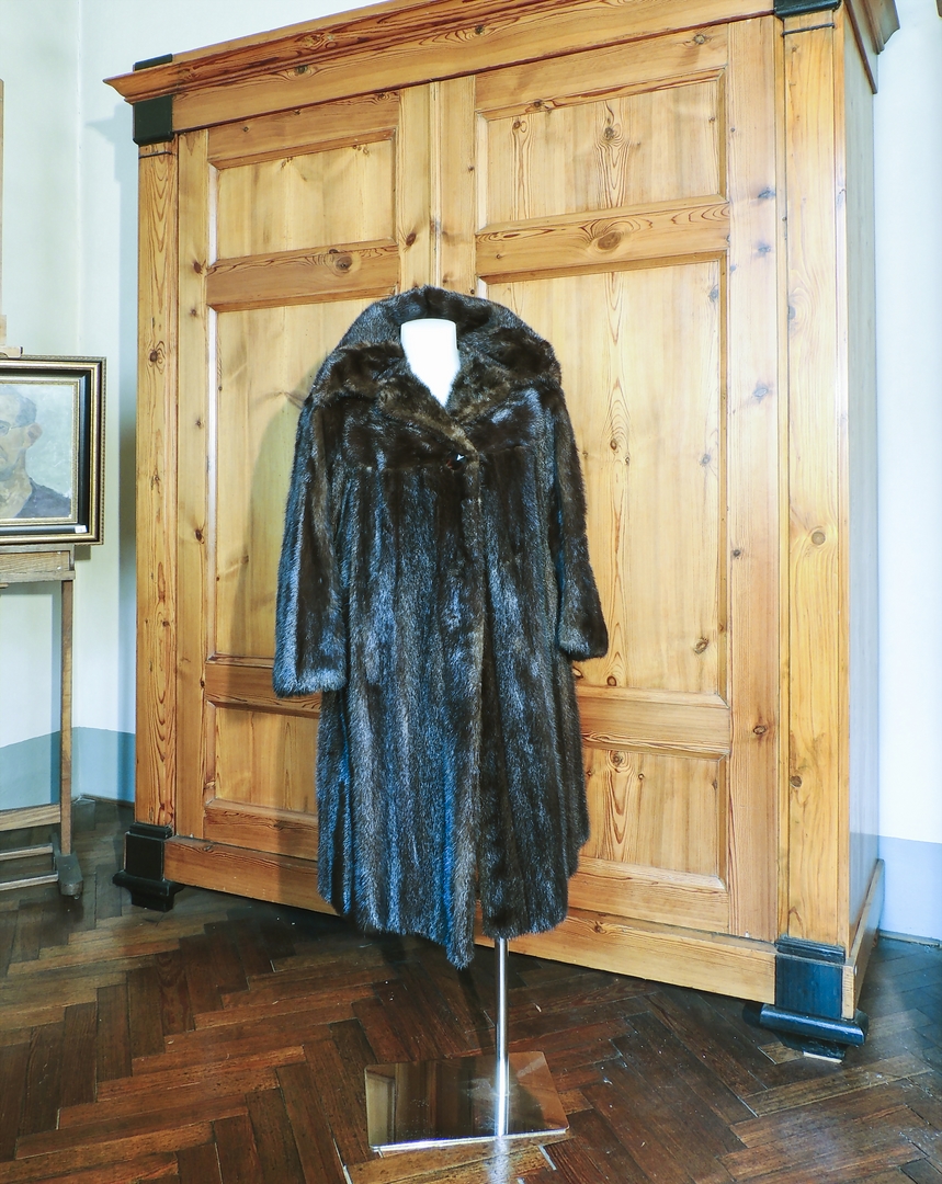 CAPPOTTO IN PELLICCIA DI VISONE MARRONE SCURO modello ampio con spallone, difetti