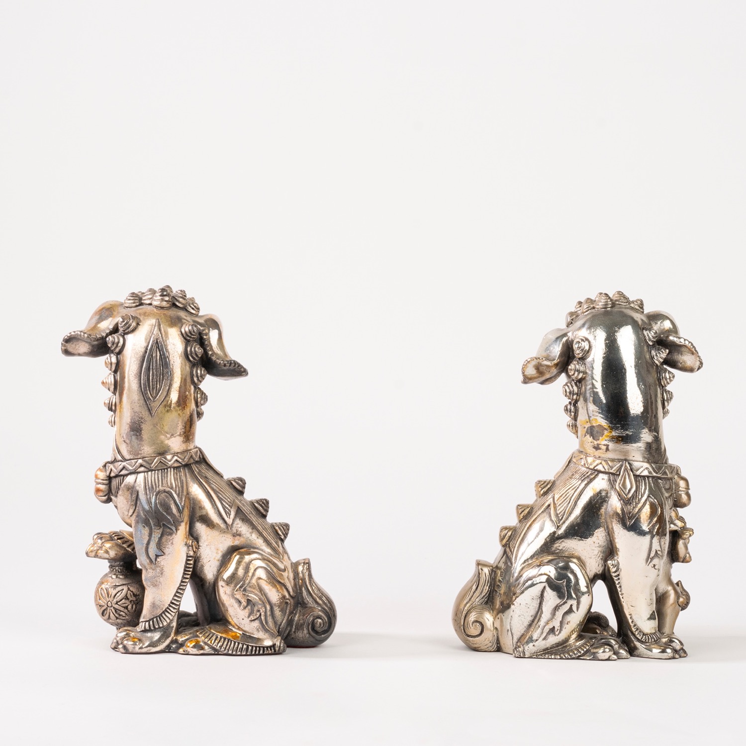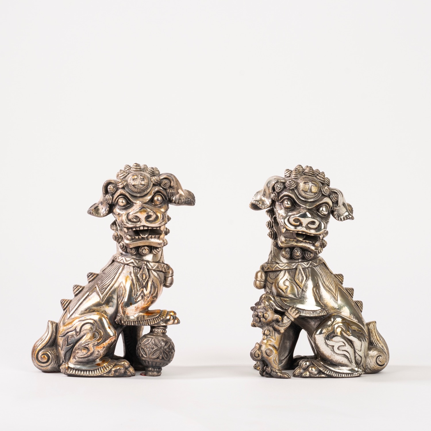Coppia di cani di Pho placcati in argento, Cina secolo XX