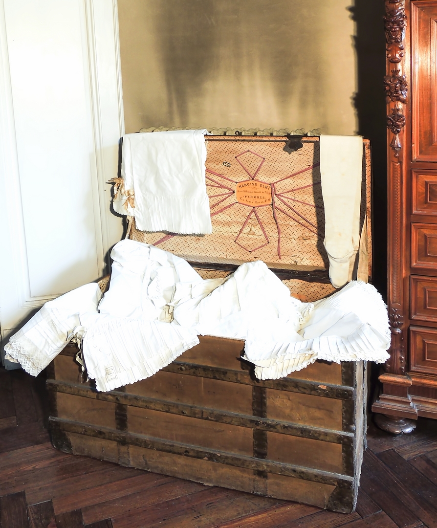 GRANDE LOTTO DI LINGERIE IN COTONE E MUSSOLA fine del XIX secolo composto da numerosi mutandoni, camicette, corpetti e biancheria varia ricamata, applicazioni in pizzo contenuti entro baule d'epoca, molti dei capi nuovi reacnti cartellino Frette