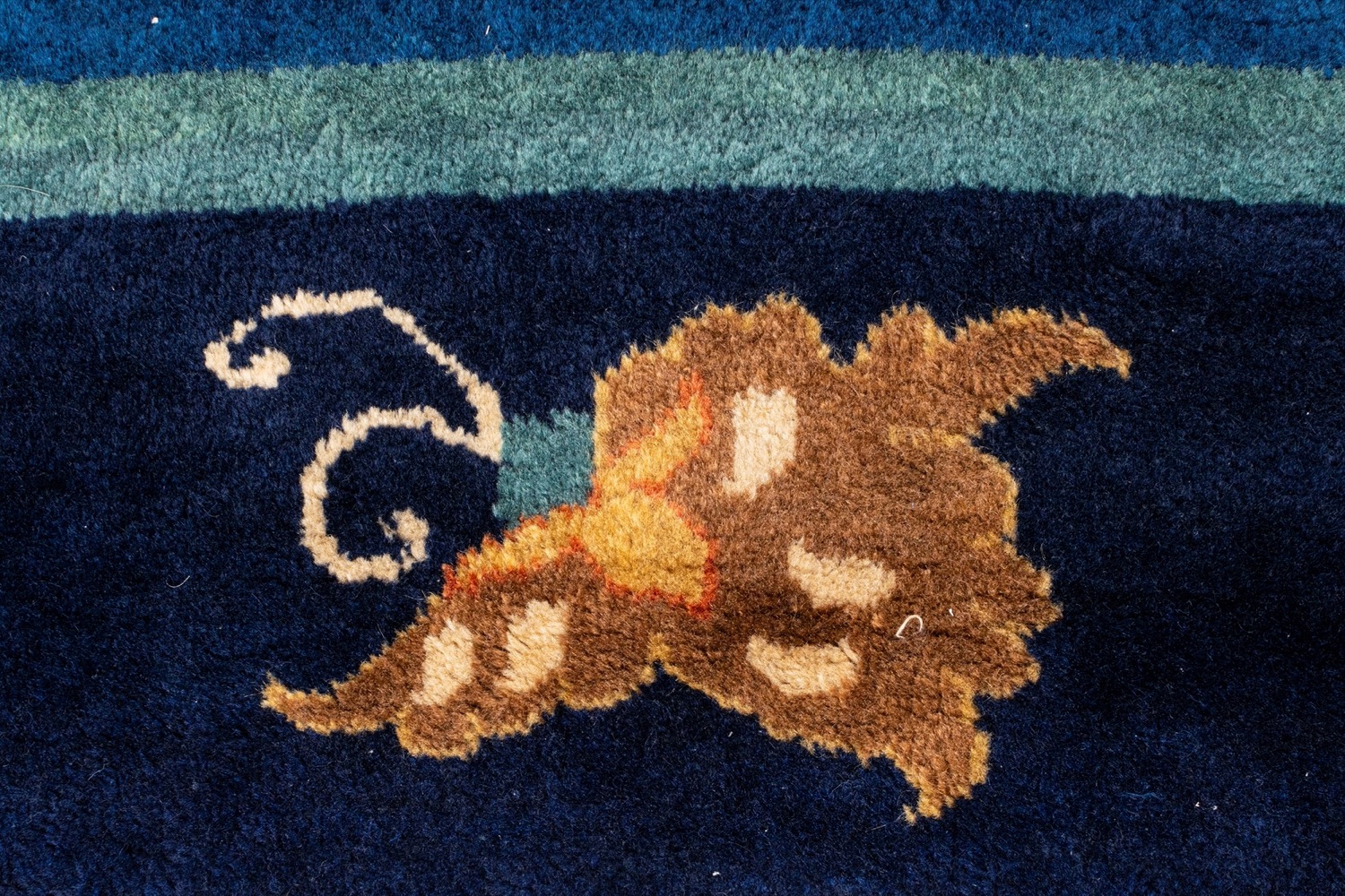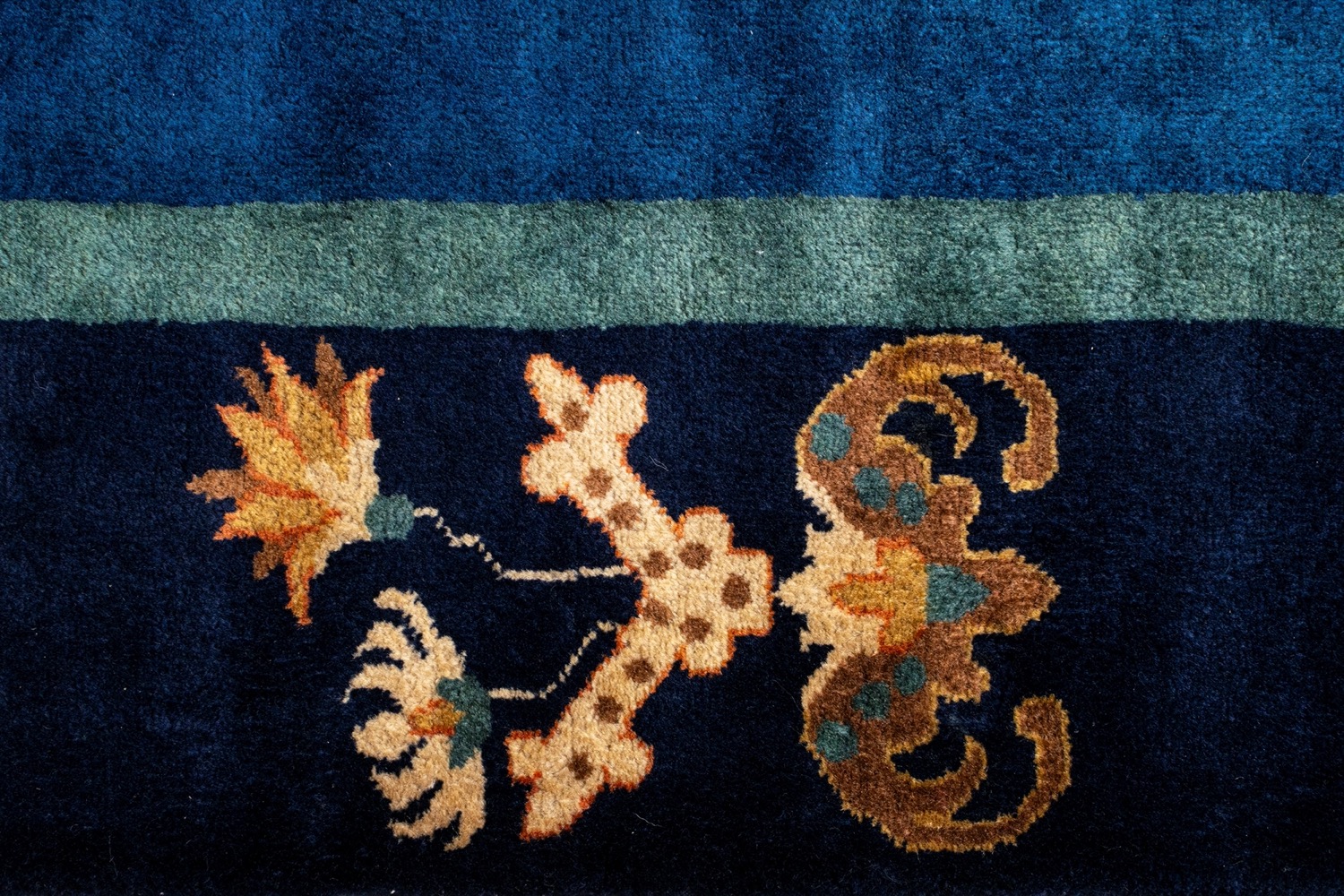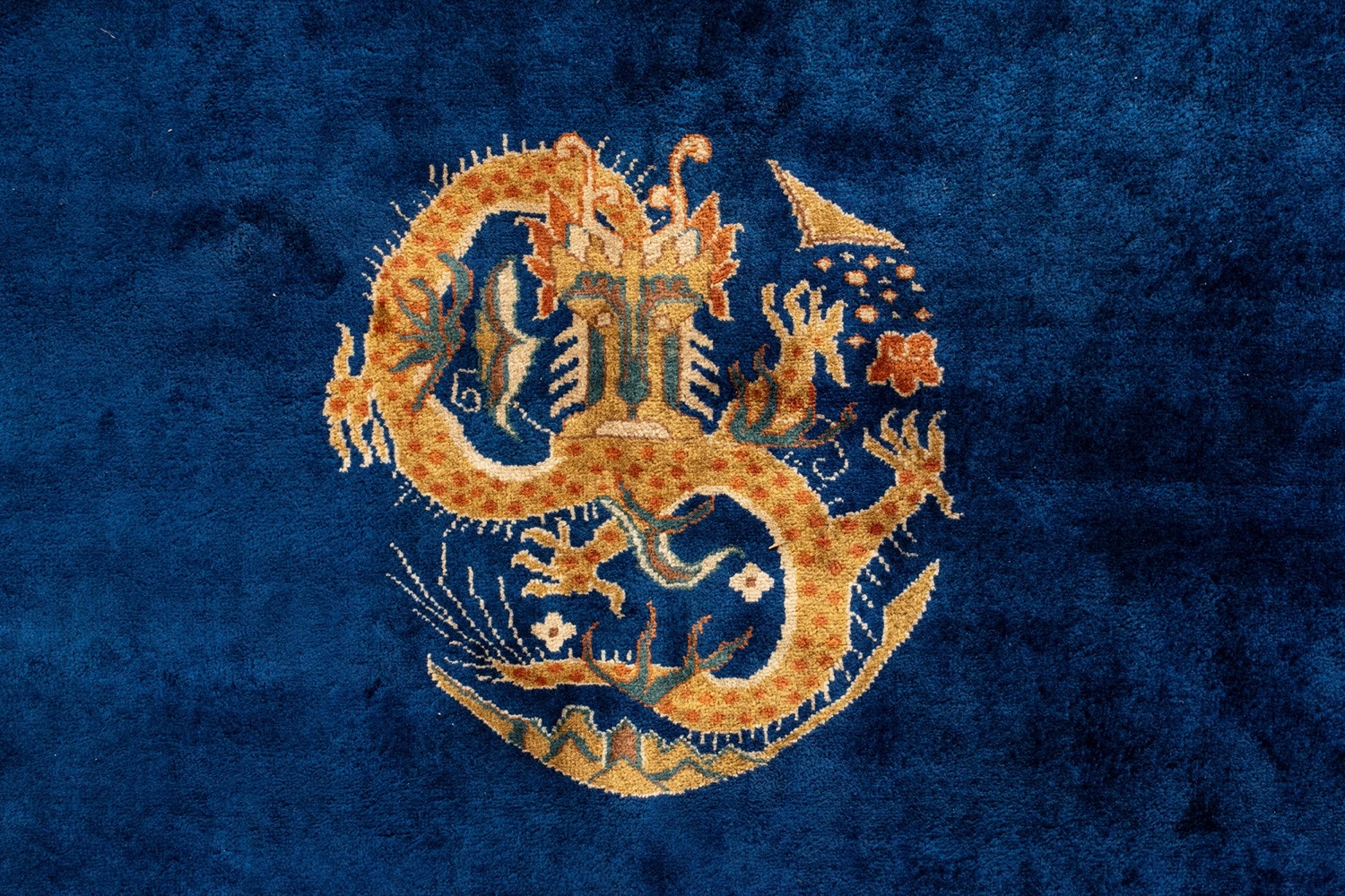 A fondo blu con dragone centrale e motivi floreali lungo i bordiA fondo blu con dragone centrale e motivi floreali lungo i bordi