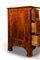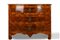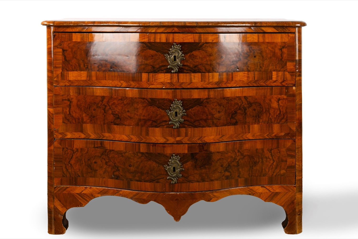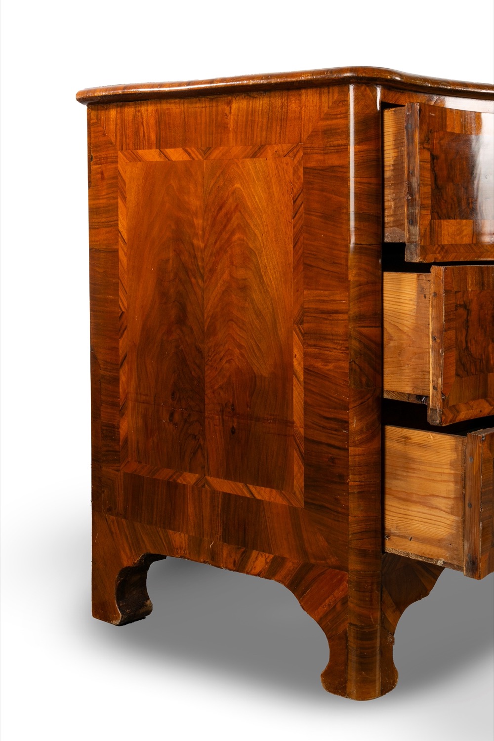 fronte mosso e tre cassetti, lastronato in radica, piedi a mensola
