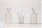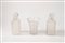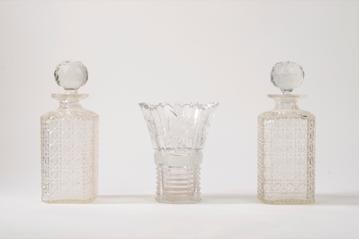 Coppia di bottiglie da liquore con tappo e un vaso portafiori in cristallo molato con decoro a motivi floreali