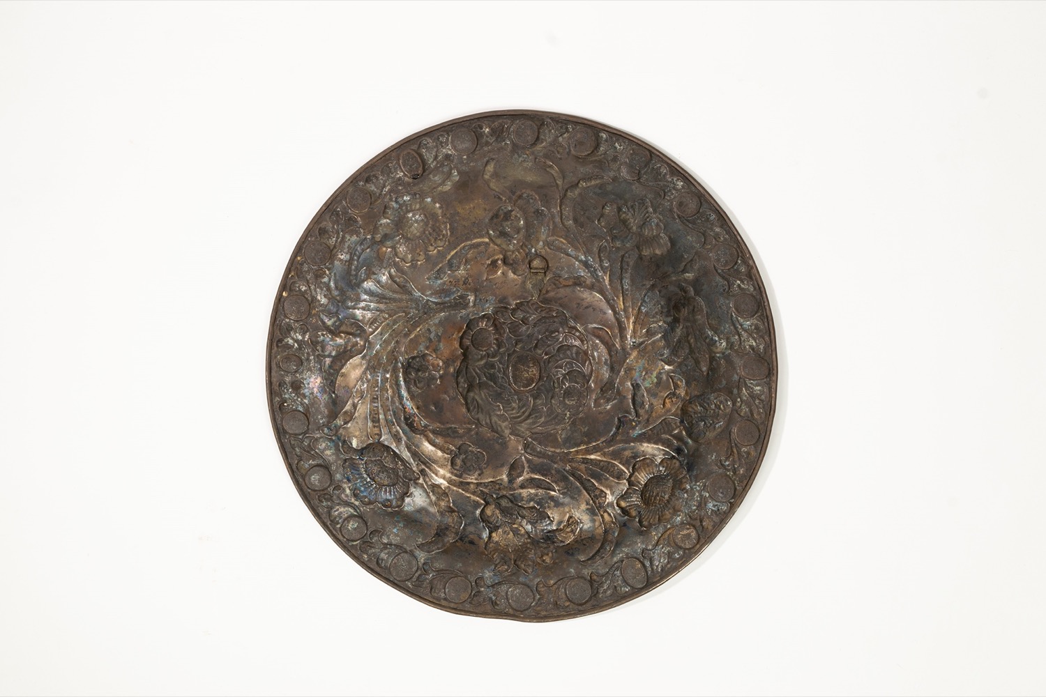Piatto da parata in rame sbalzato e inciso a motivi floreali