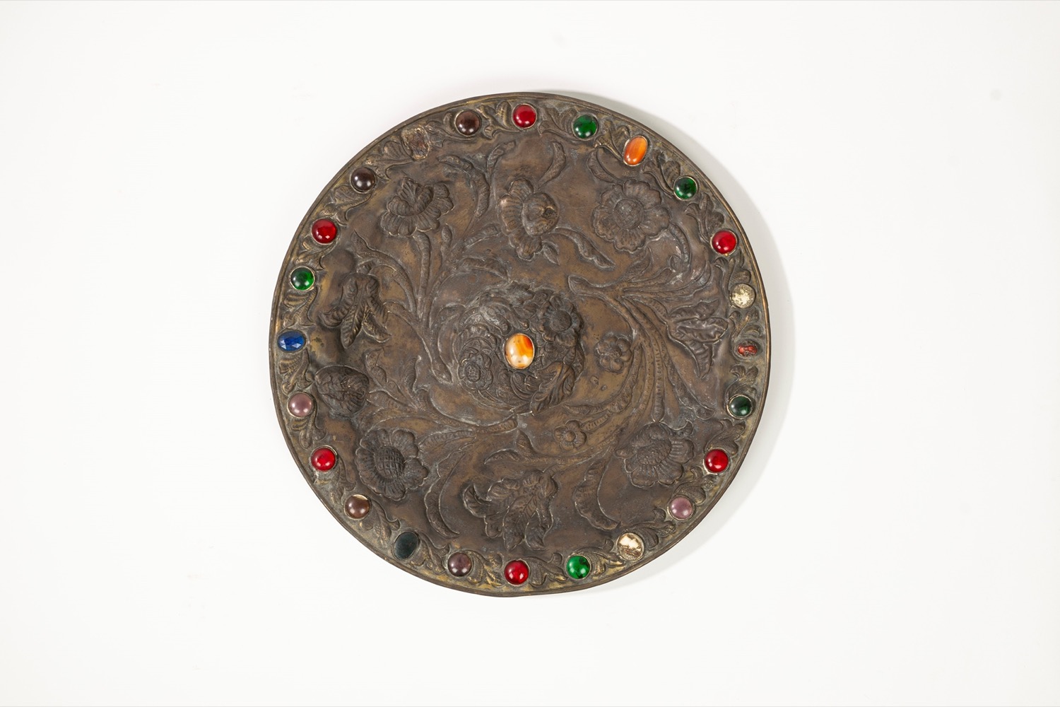 centro del cavetto umbonato, decorato con cabochons in paste vitree policrome (mancanze)centro del cavetto umbonato, decorato con cabochons in paste vitree policrome (mancanze)