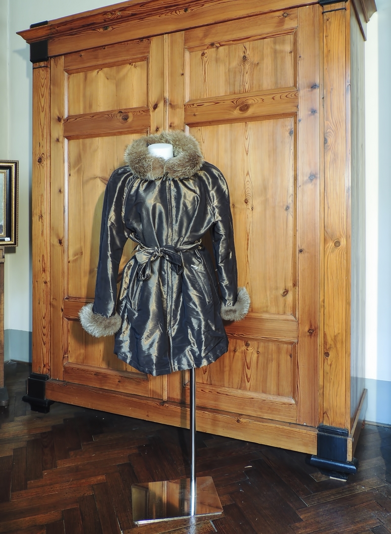 GIACCONE TRE QUARTI IN TESSUTO TECNICO COLOR BRONZO Escada con collo in pelliccia, difetti