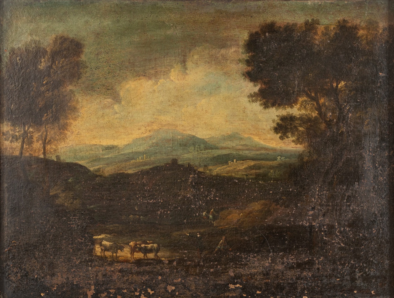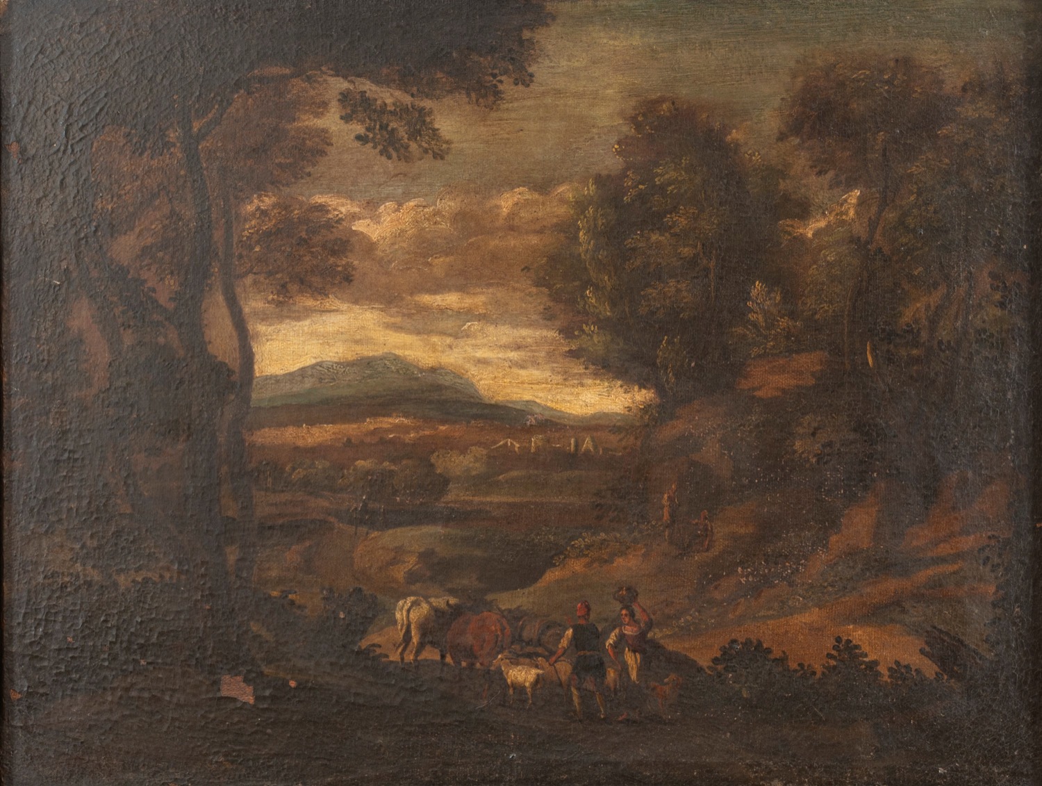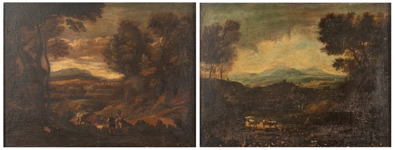 Scuola italiana, secolo XVII - Due paesaggi boschivi con astanti