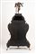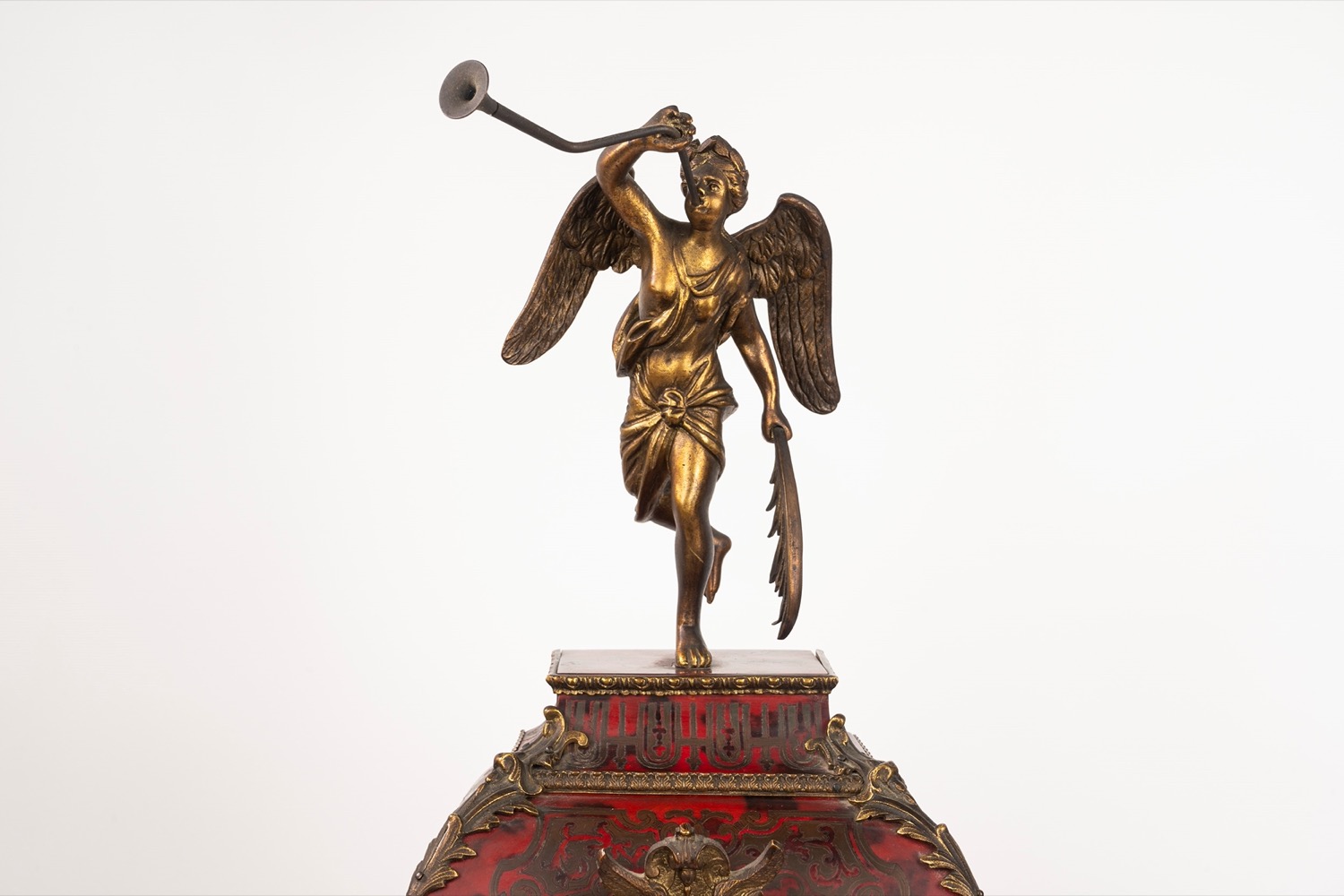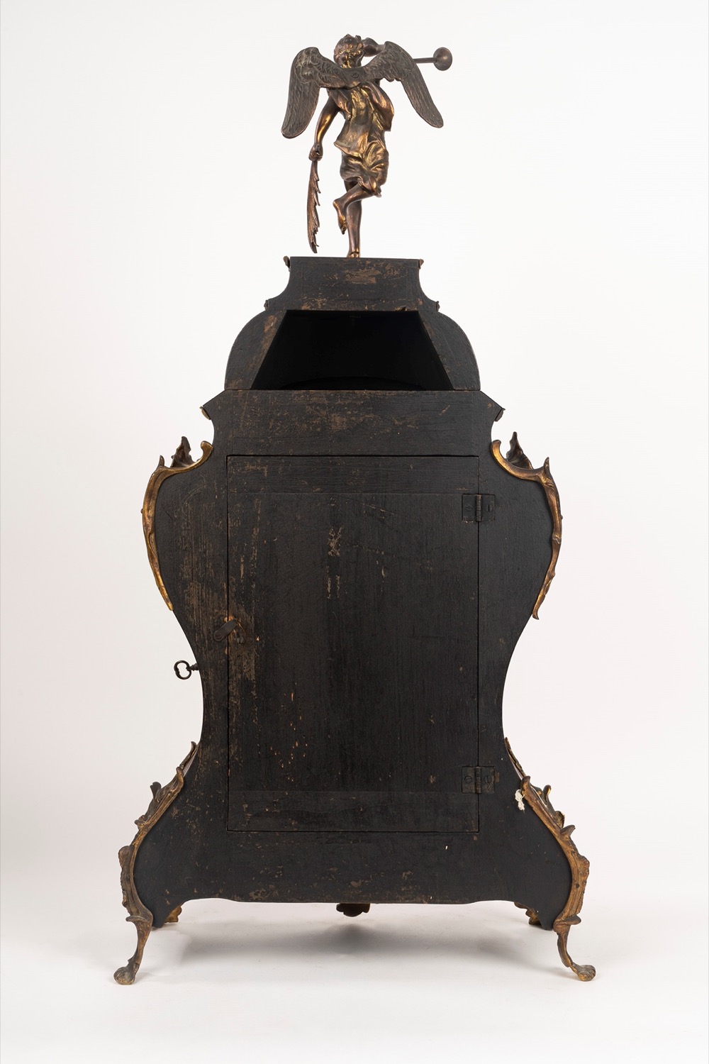quadrante a cartouche in bronzo e smalto a numeri romani per le ore e arabi per i minuti, terminale in bronzo raffigurante allegoria della Fama