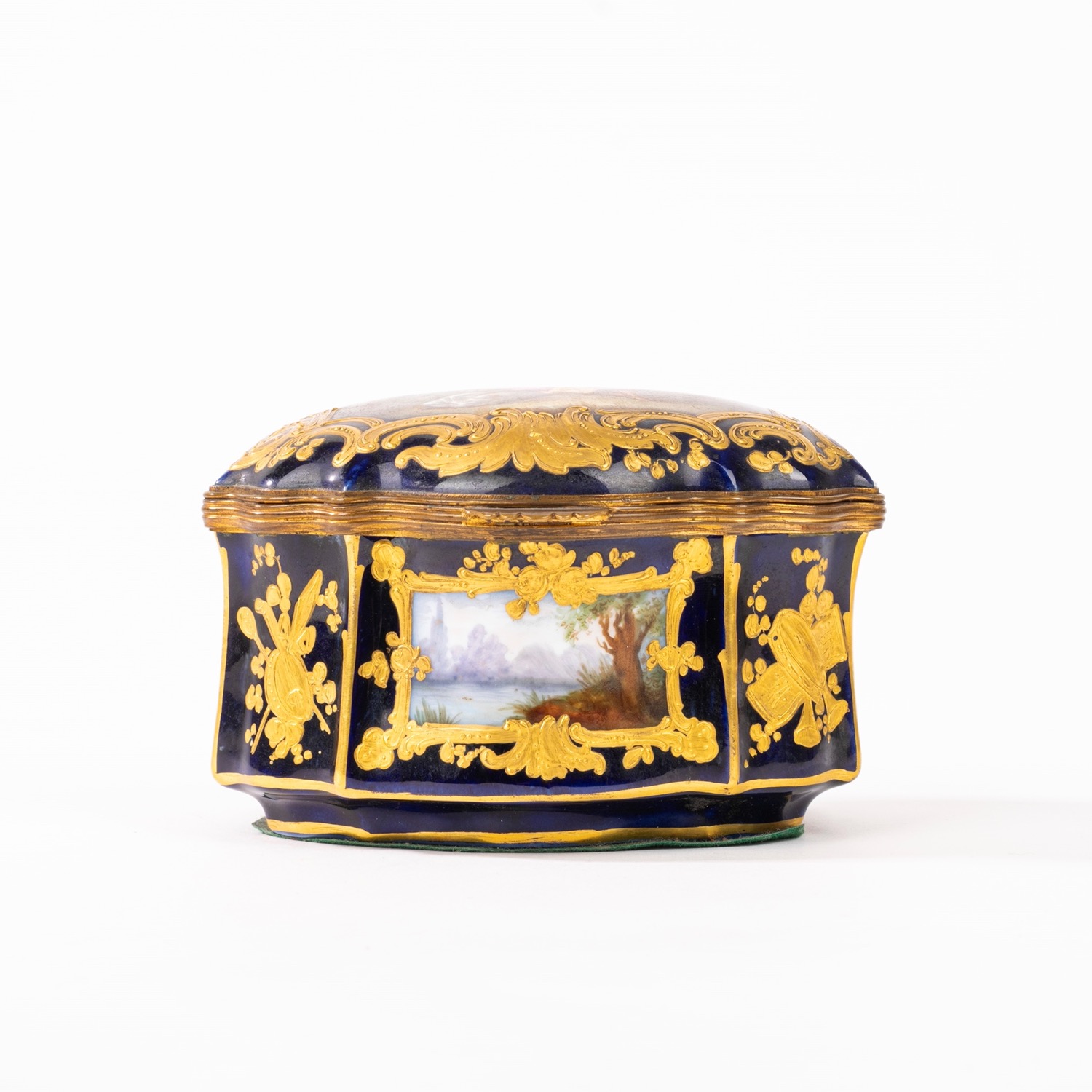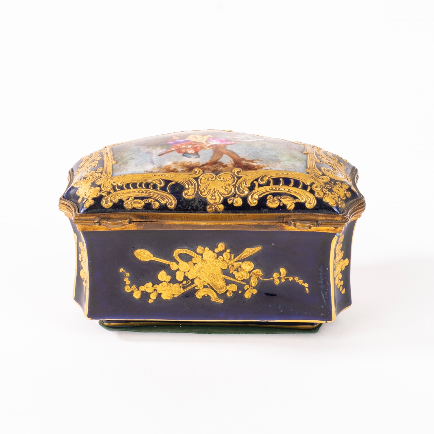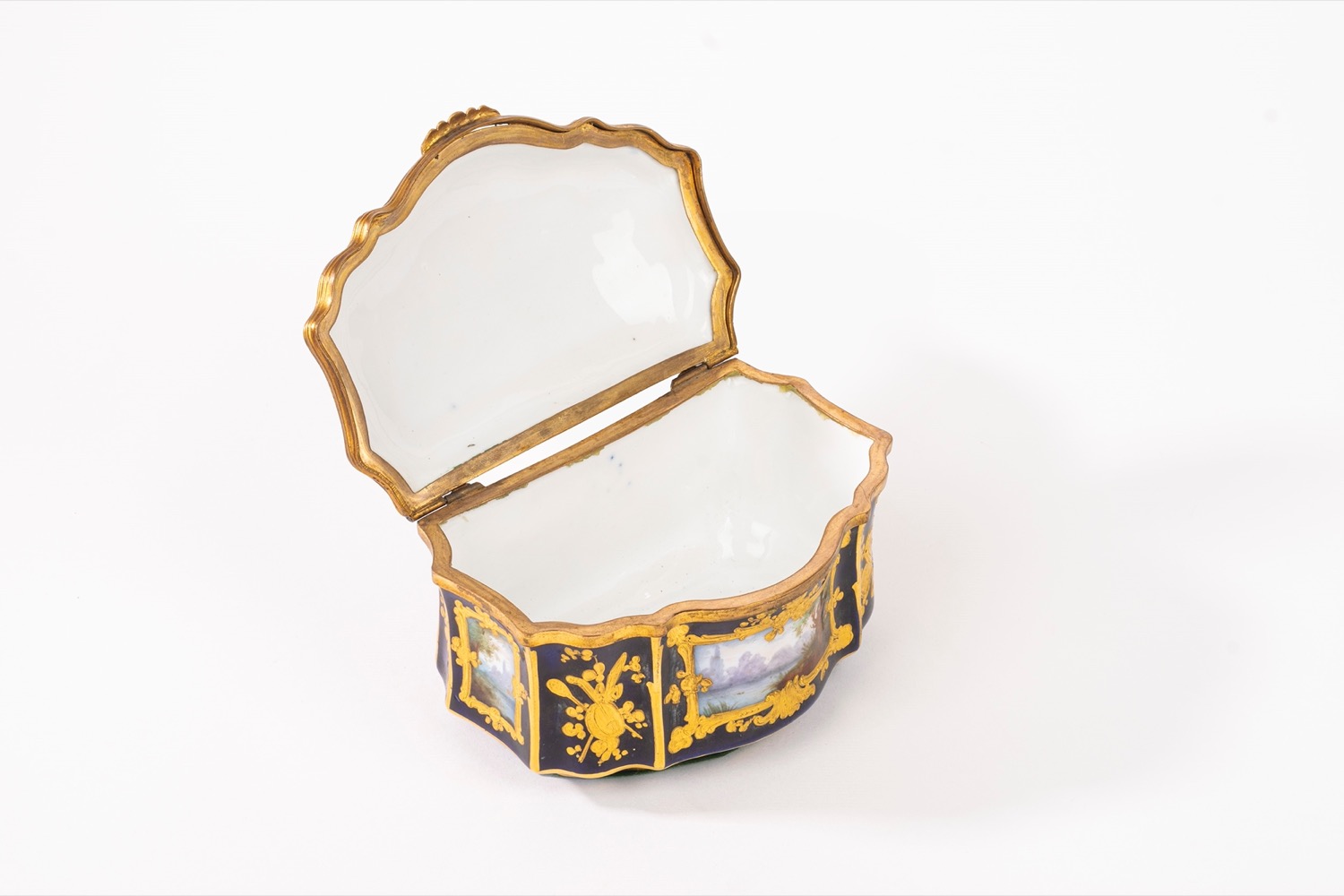 Cofanetto di forma mossa in porcellana policroma su fondo blu, manifattura di Sèvres, fine secolo XIX - inizi secolo XX