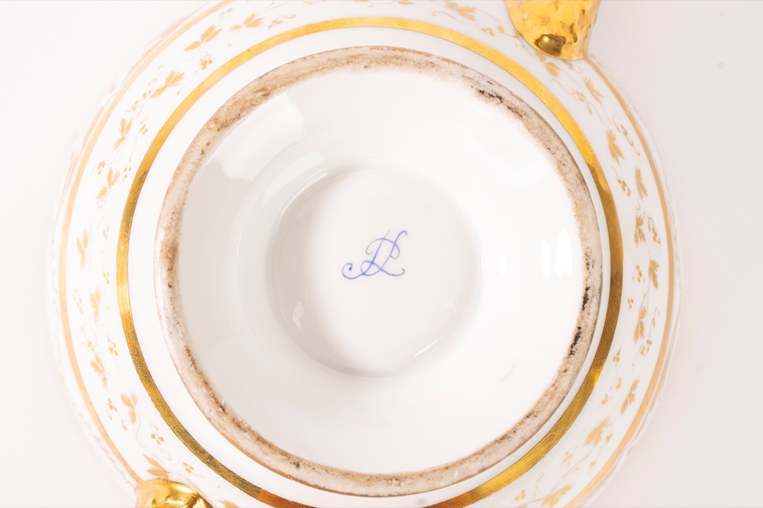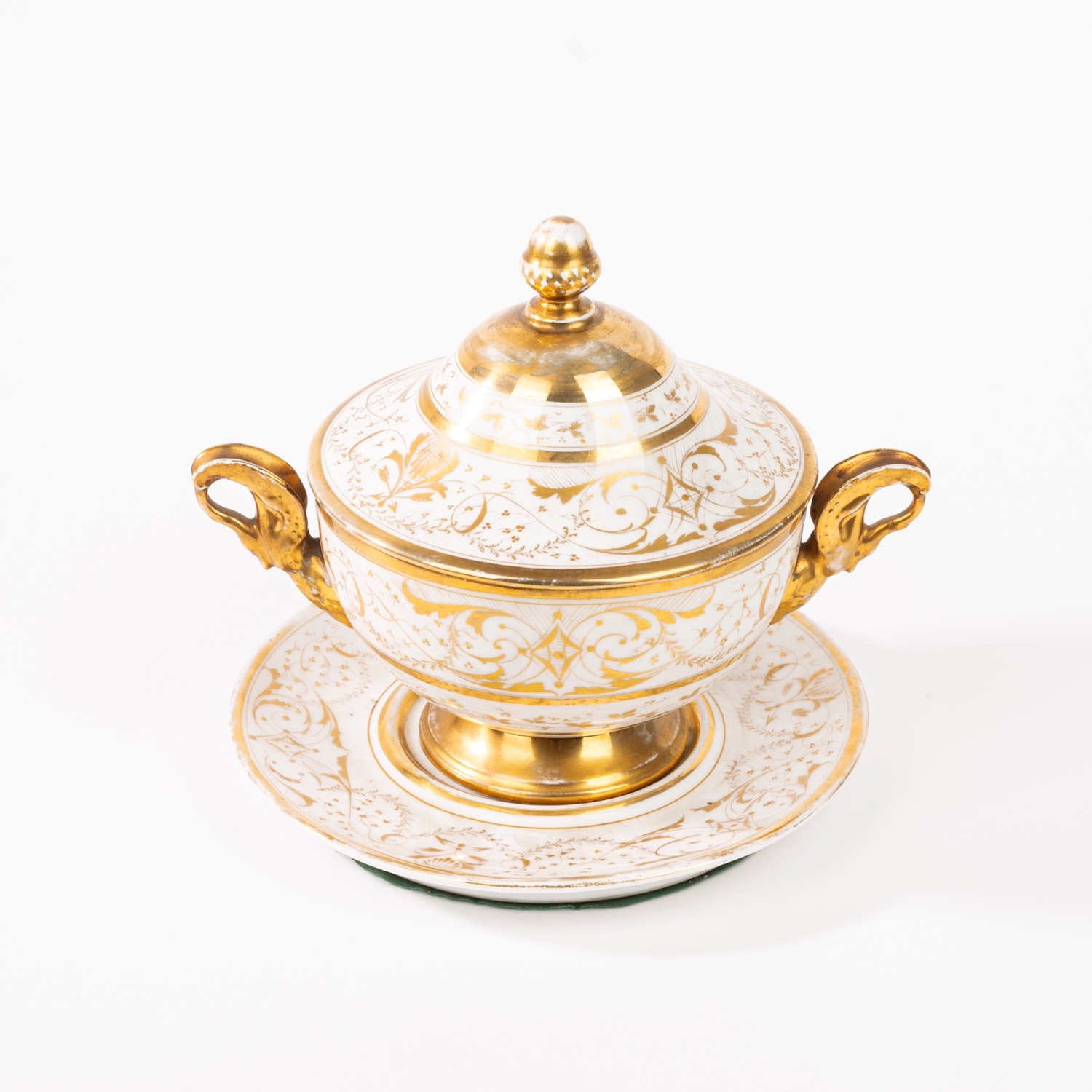Lotto 409 | Tazza da puerpera con piatto, in porcellana bianca e oro, Francia, secolo XIX