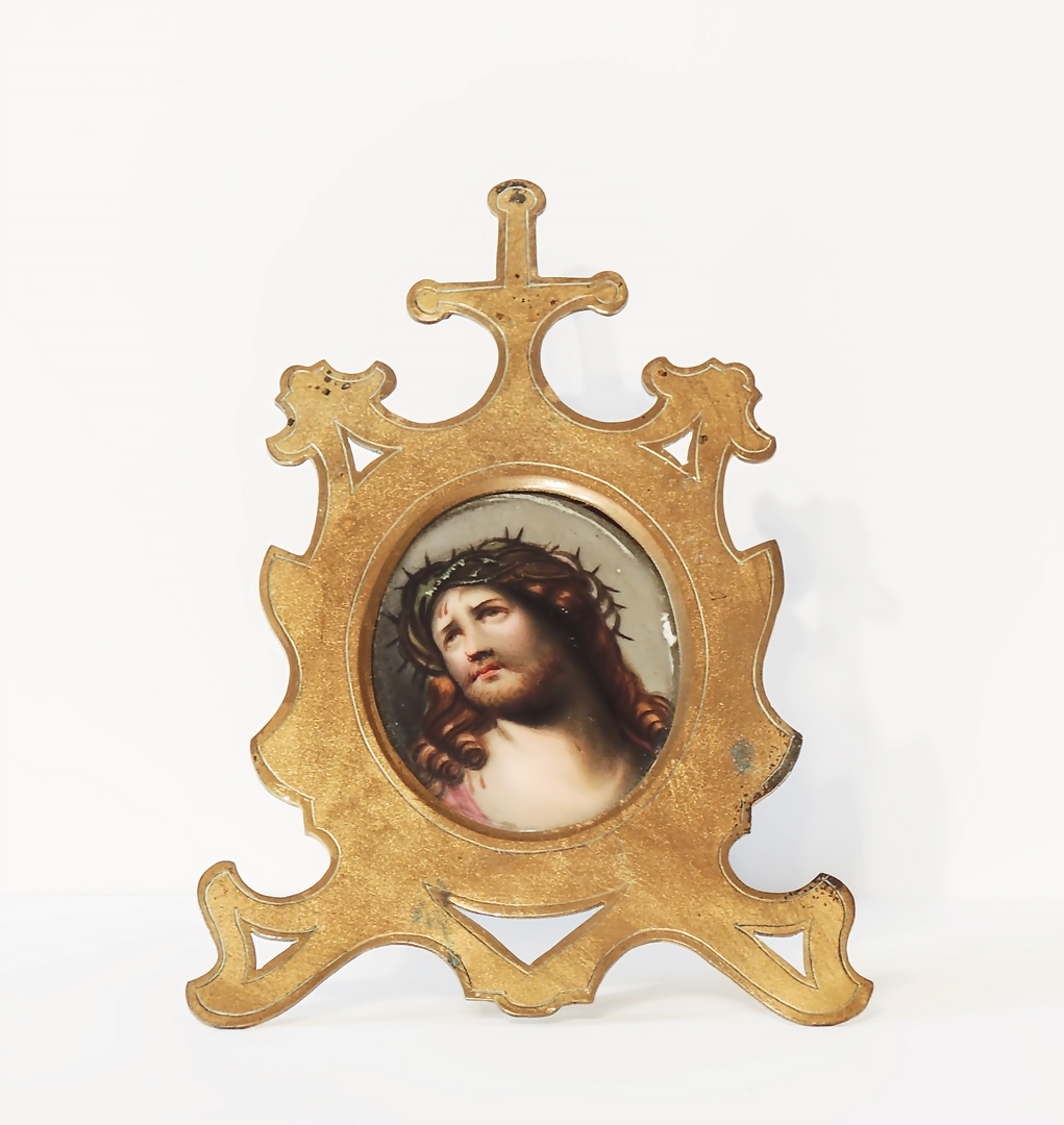ECCE HOMO miniatura dipinta su porcellana, in cornice sagomata in metallo dorato