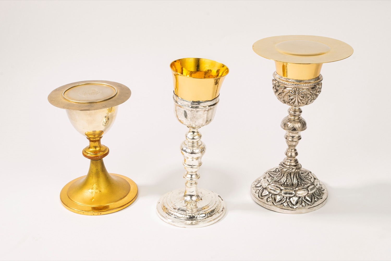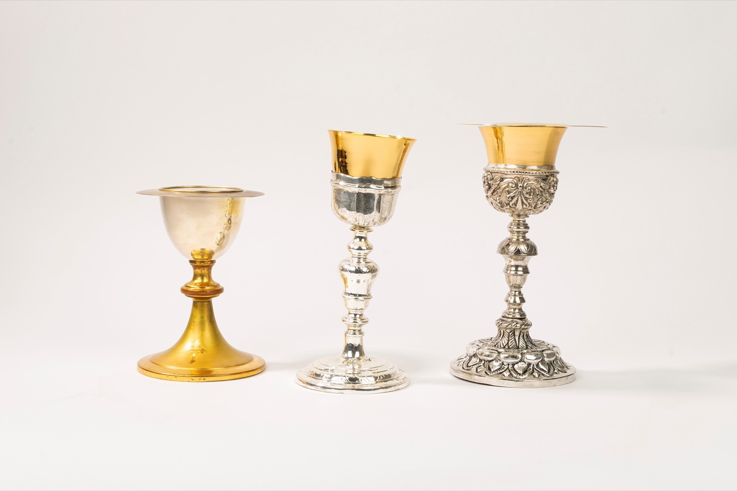 un calice con corpo e base in metallo argentato sbalzato e decorato con motivi fogliacei e teste di cherubini e coppa in argento dorato con bollo 800; uno con corpo e base in metallo dorato e coppa in argento dorato; uno in metallo argentato e dorato; due piattini in metallo dorato di cui uno con bollo Sterlingun calice con corpo e base in metallo argentato sbalzato e decorato con motivi fogliacei e teste di cherubini e coppa in argento dorato con bollo 800; uno con corpo e base in metallo dorato e coppa in argento dorato; uno in metallo argentato e dorato; due piattini in metallo dorato di cui uno con bollo Sterling