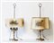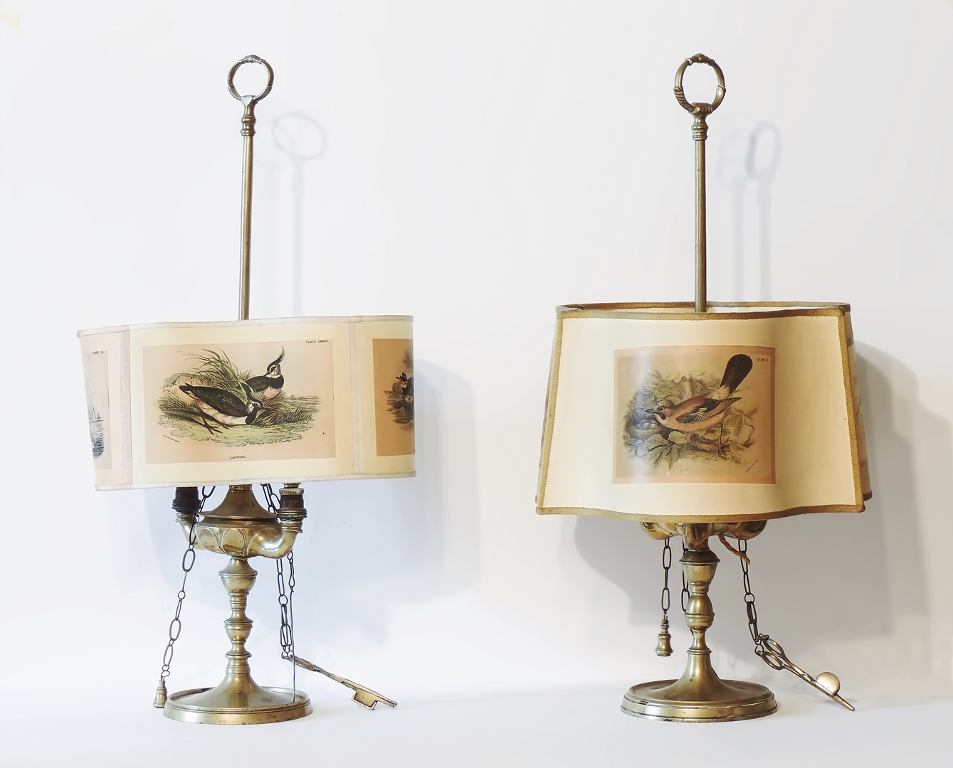 TRE LUCERNE FIORENTINE IN OTTONE corredate di paralume in carta con applicate stampe con volati