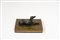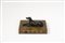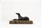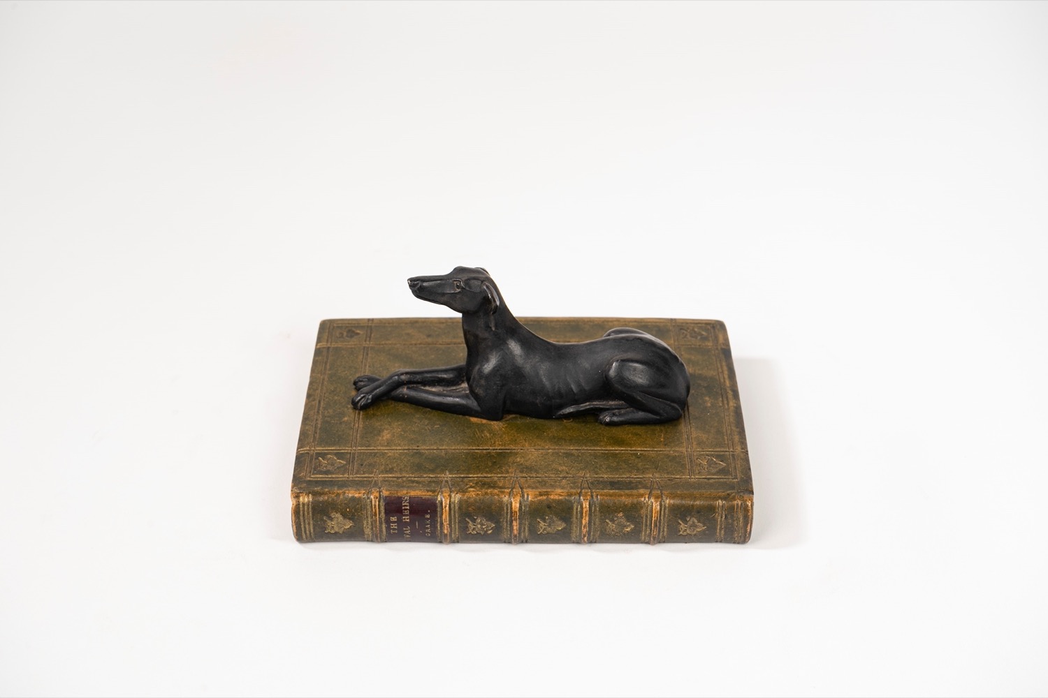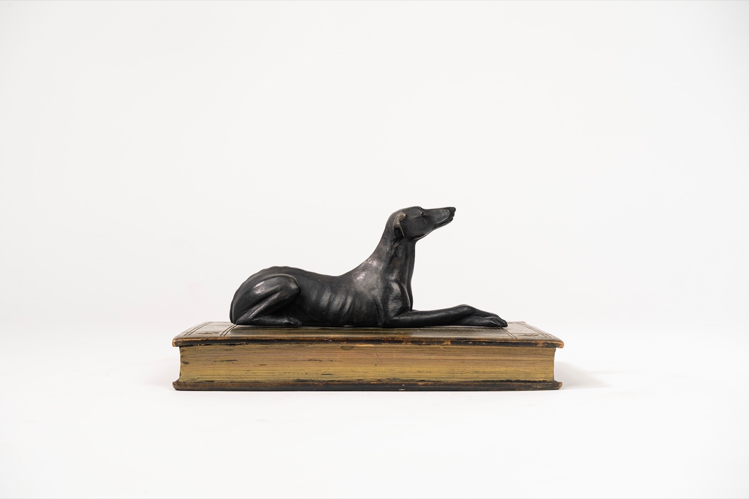 Fermacarte in legno dipinto a forma di levriero accovacciato su libro