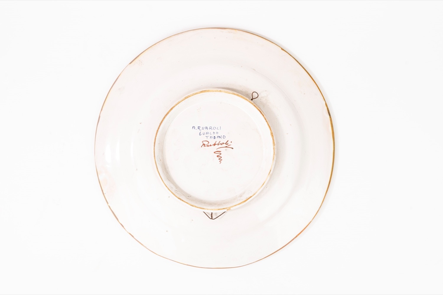 il cavetto decorato a grottesche con mascherone di satiro, la tesa a quartieri con motivo a embricazioni a occhio di penna di pavone alternato a girali di foglie e fiori. Al retro firmato A. Rubboli Gualdo Tadino in blu, Rubboli a lustroil cavetto decorato a grottesche con mascherone di satiro, la tesa a quartieri con motivo a embricazioni a occhio di penna di pavone alternato a girali di foglie e fiori. Al retro firmato A. Rubboli Gualdo Tadino in blu, Rubboli a lustro