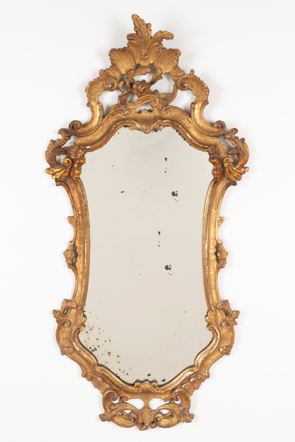 Specchiera di forma mossa in legno intagliato e dorato a volute fogliate, secolo XX