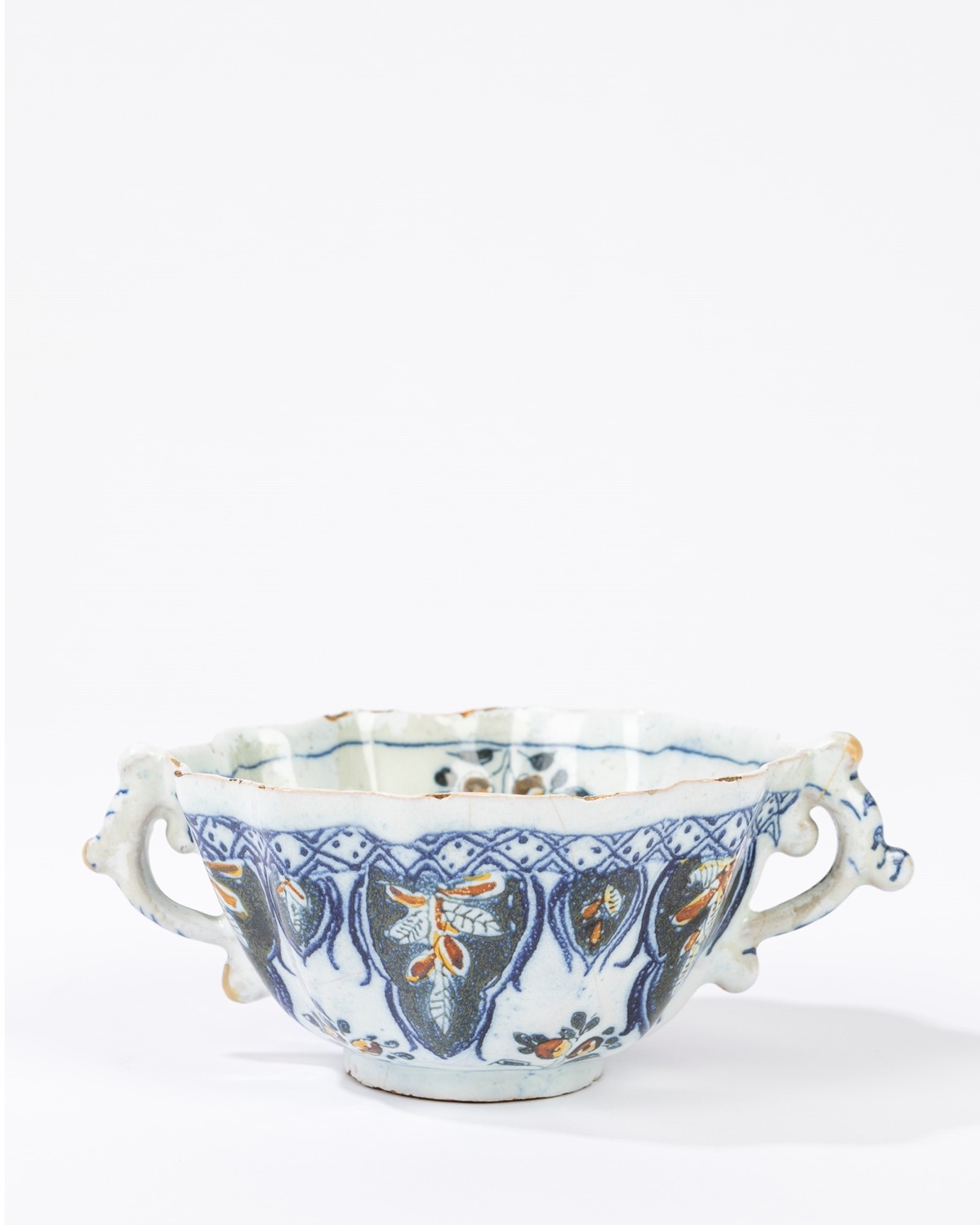 di forma mossa e costolata, biansata, decorata all'interno con figura di Gesù benedicente e iscrizione entro cartiglio "Gesù mio Dio vi dono il cor… mio", marca e data 1721 alla base (restauri)di forma mossa e costolata, biansata, decorata all'interno con figura di Gesù benedicente e iscrizione entro cartiglio "Gesù mio Dio vi dono il cor… mio", marca e data 1721 alla base (restauri)