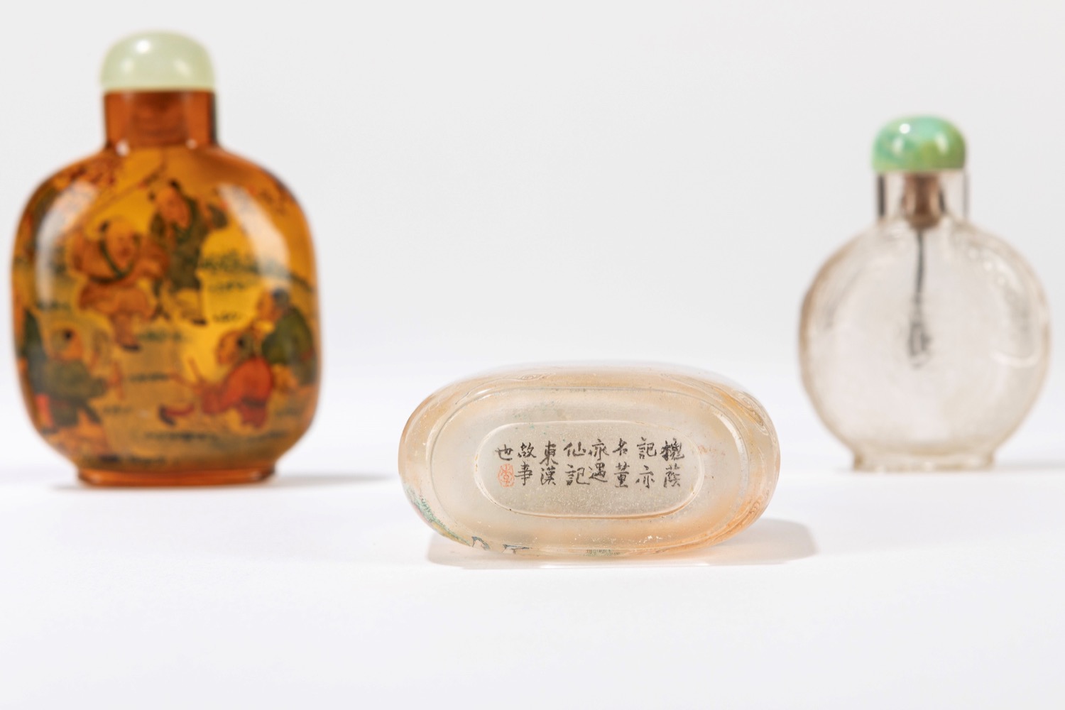 una firmata Li Kechang, di forma arrotondata, dipinta all'interno con figure di fanciulle; una dipinta all'interno con fanciulli che giocano e con tappo in giadeite; una in vetro inciso a motivi beneaguranti e un'altra in quarzo.