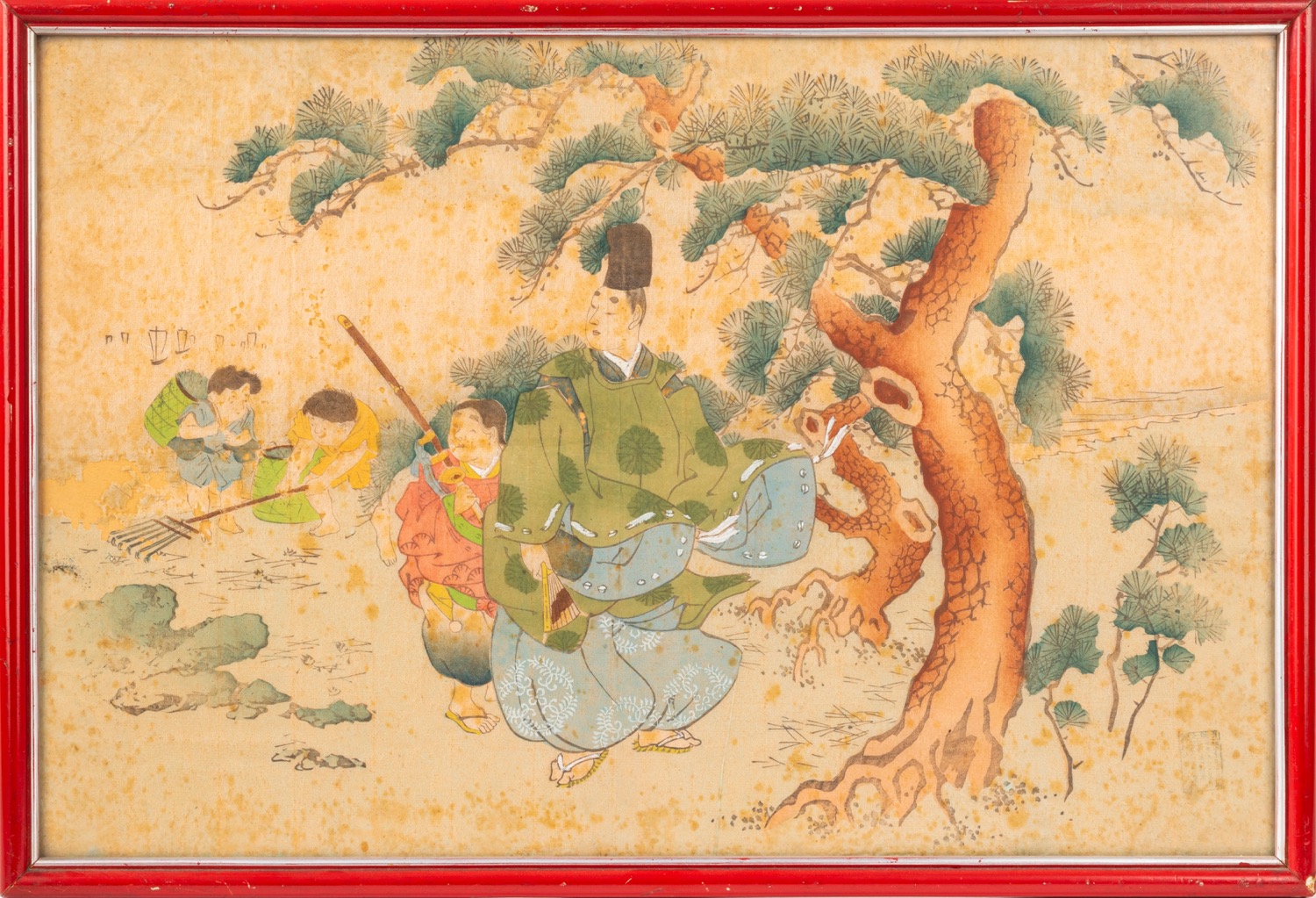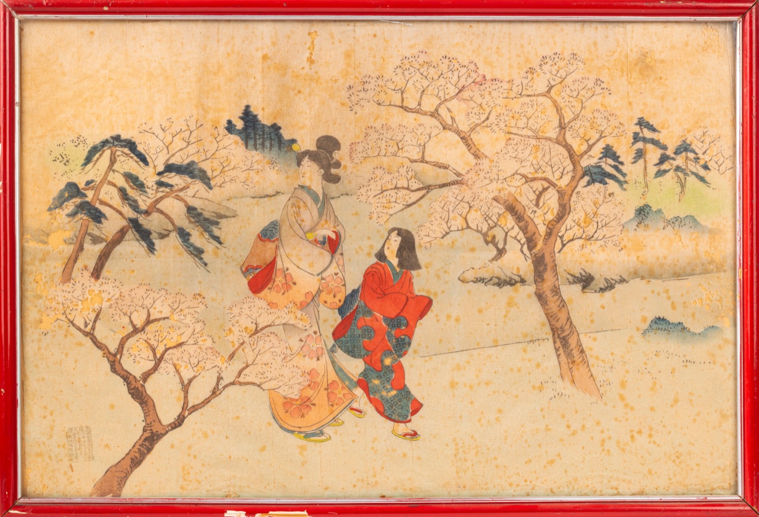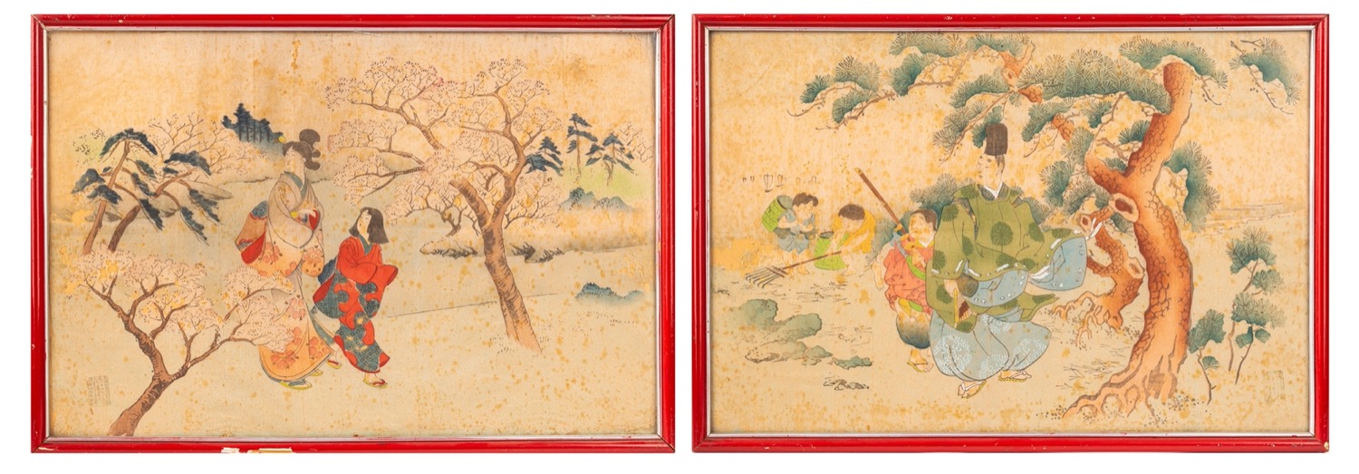 raffiguranti due dame in un paesaggio con alberi di ciliegio; e un dignitario con tre accoliti in un paesaggio alberato; in cornice (difetti)raffiguranti due dame in un paesaggio con alberi di ciliegio; e un dignitario con tre accoliti in un paesaggio alberato; in cornice (difetti)