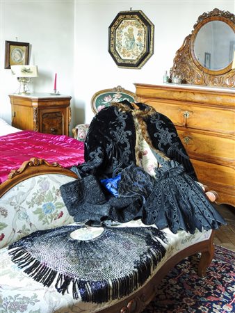 LOTTO DI ABBIGLIAMENTO DA SIGNORA DA SERA fine del XIX/inizio del XX secolo composto da un copri spalle interamente realizzato con una rete in jais con lunga frangia e chiusura in raso a fiocco; una mantella in velluto nero, ornata da volute e girali in raso e applicazioni in pelliccia; una mantellina in panno nero interamente traforata e ricamata in perline, collo con ruches plissettate; uno scialle in tulle con applicazioni in raso nero e fodera blu ed alcuni teli per realizzare una mantella interamente ricamati con ramages in perline, alcuni difetti