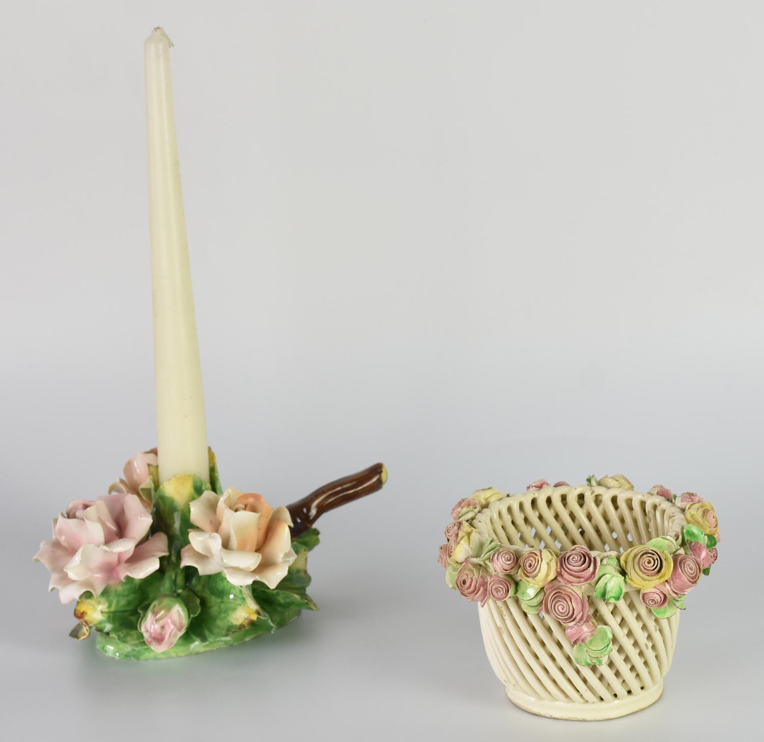 ceramica bianca intrecciata con corona di roselline e foglie colorate sul bordo