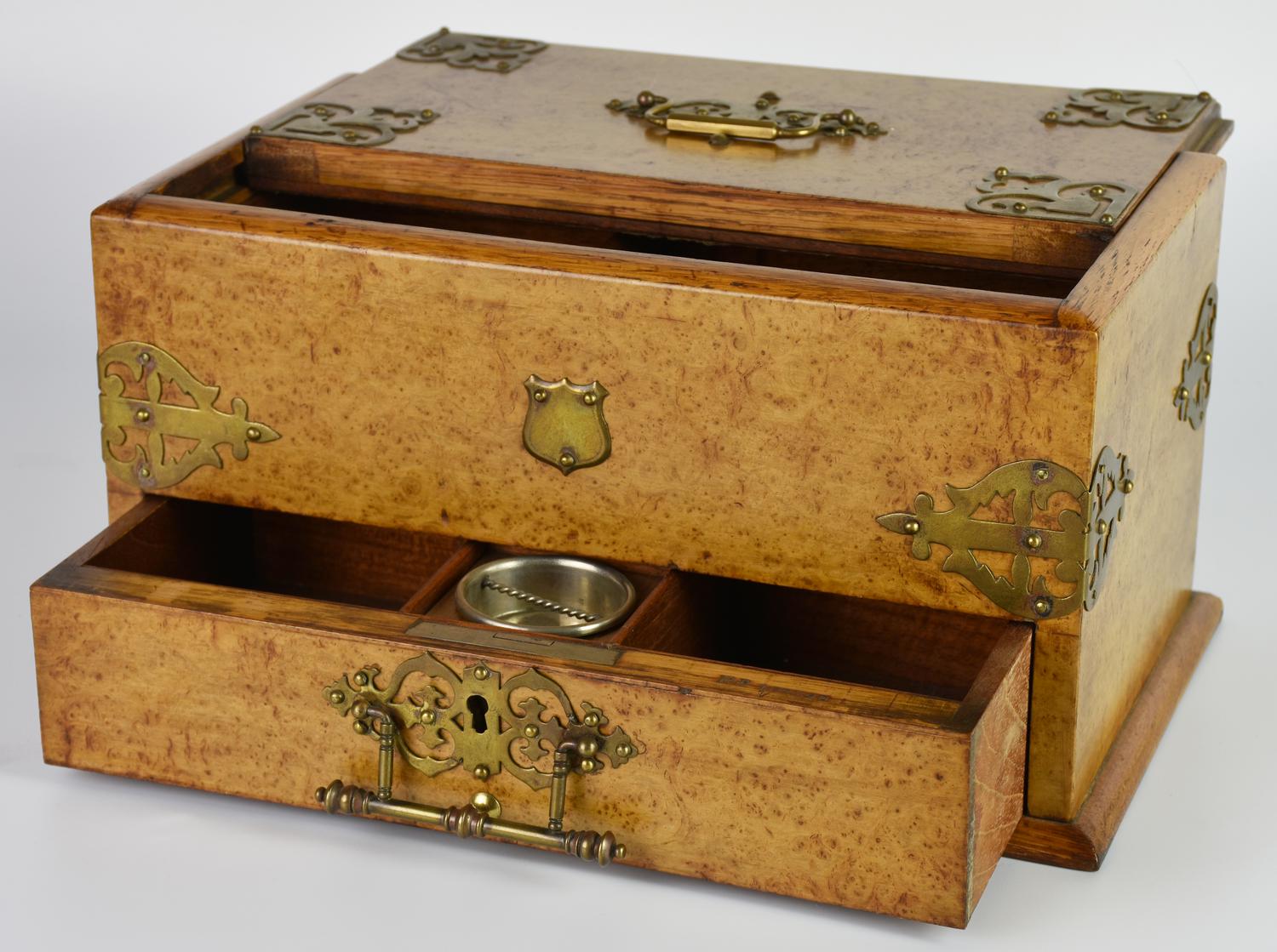 lastronato in radica di olmo con filettature in ottone traforato; apertura del cassetto con meccanismo a scorrimento del coperchio