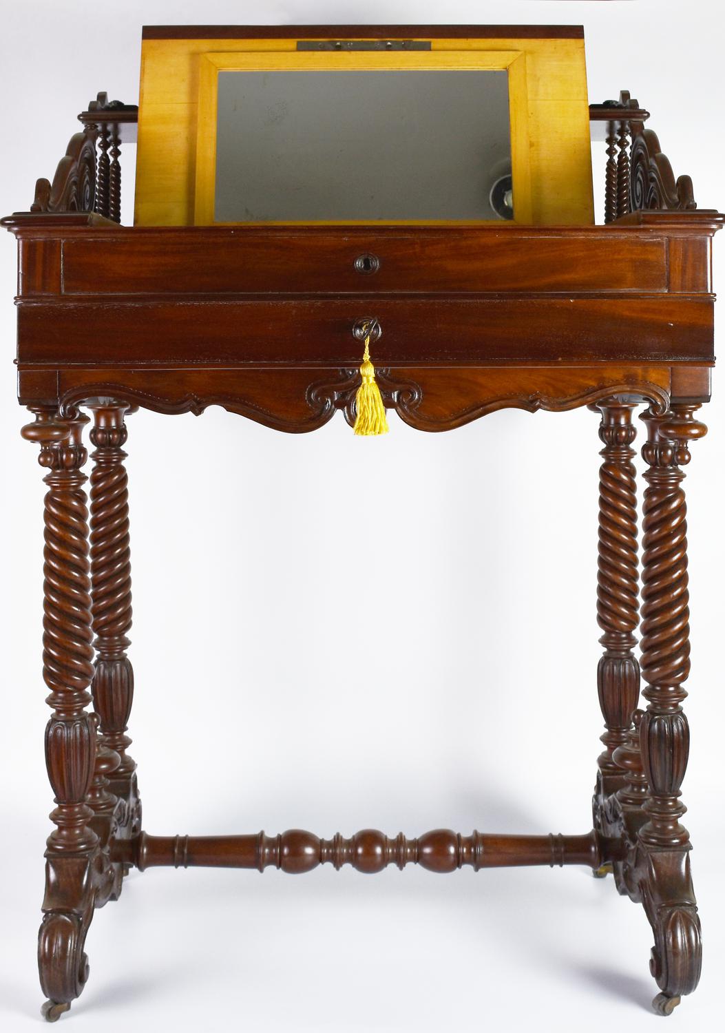 legno di mogano con piano ribaltabile, interno in legno di acero; alzata a giorno con colonnine a tortiglione